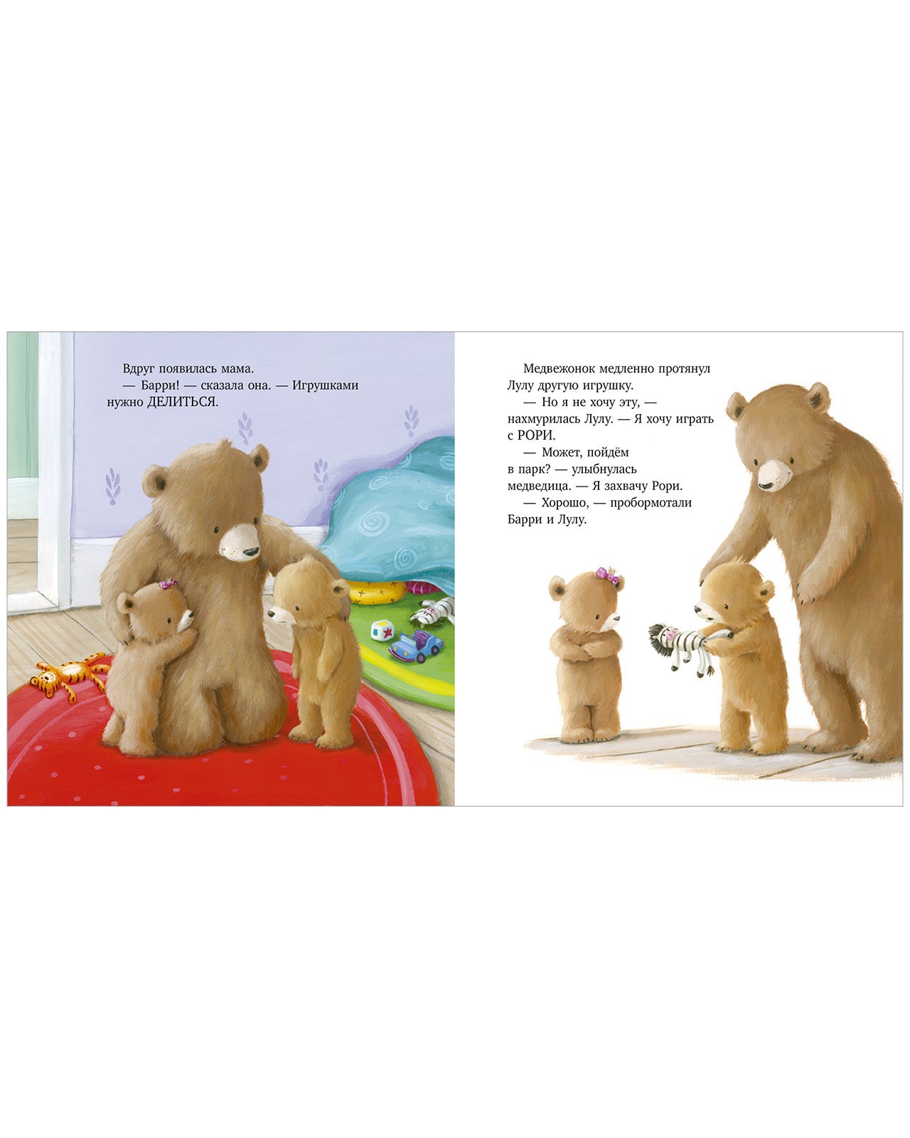 Медвежатам Лулу и Барри весело играть! Но только до тех пор, пока Лулу не берет в свои пушистые лапки любимую игрушку друга — тигра Рори. Барри не хочет делиться, а Лулу не хочет уступать. Неужели веселым играм конец? Хорошо, что мама-медведица знает, как все исправить!