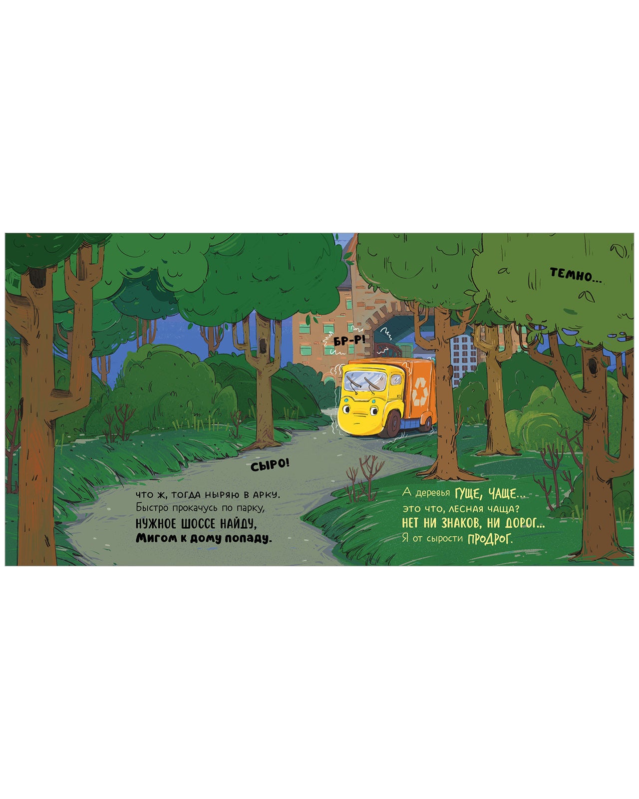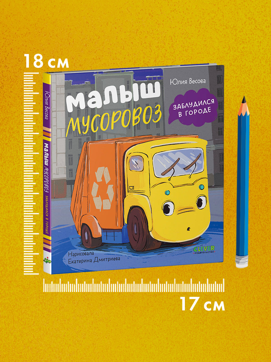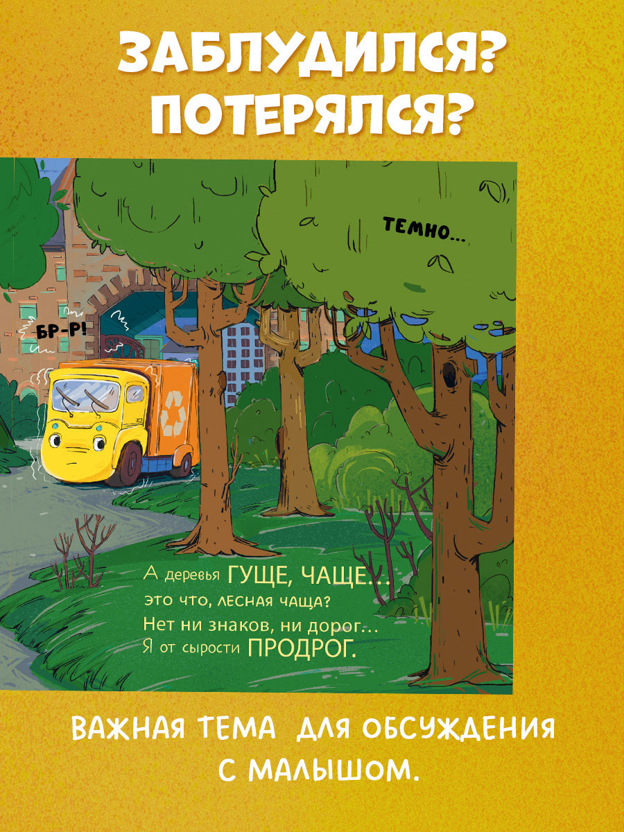 Мусоровоз прокатился по всем знакомым улицам. Да так увлекся, что не заметил, как совсем стемнело. Он больше не узнавал дома вокруг... Ой, герой книжки, малыш мусоровоз, заблудился! Кто поможет ему найти путь домой?