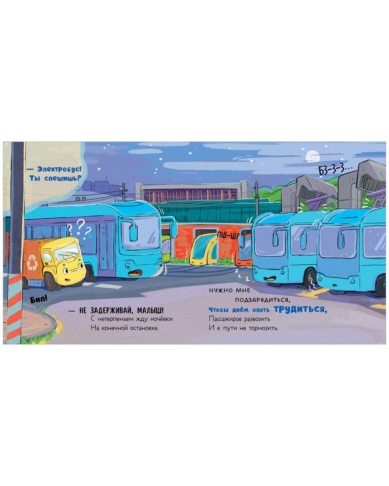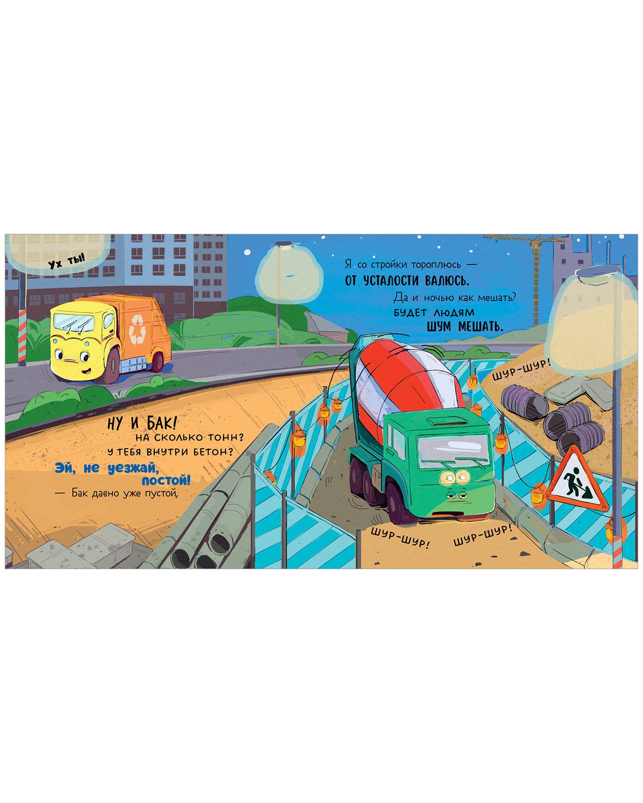 Как и всем детям, малышу мусоровозу очень не хочется ложиться спать. Он хочет продолжить веселье и отчаянно ищет, с кем бы ему покататься по ночным улицам. Но бетономешалка целый день трудилась на стройке, трамвай и электробус возили пассажиров, а самосвал доставлял груз, и все они очень устали и спешат на стоянку и в депо.