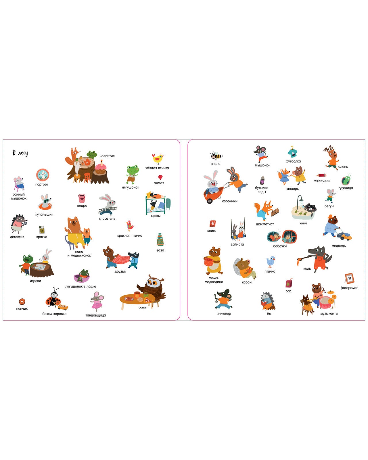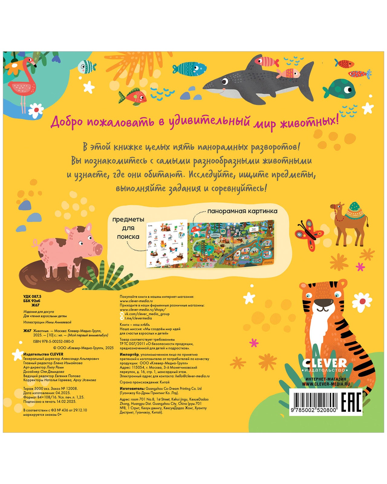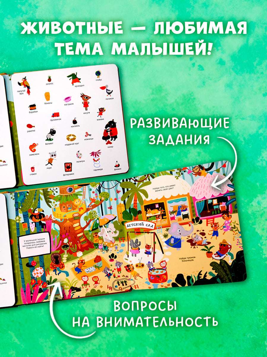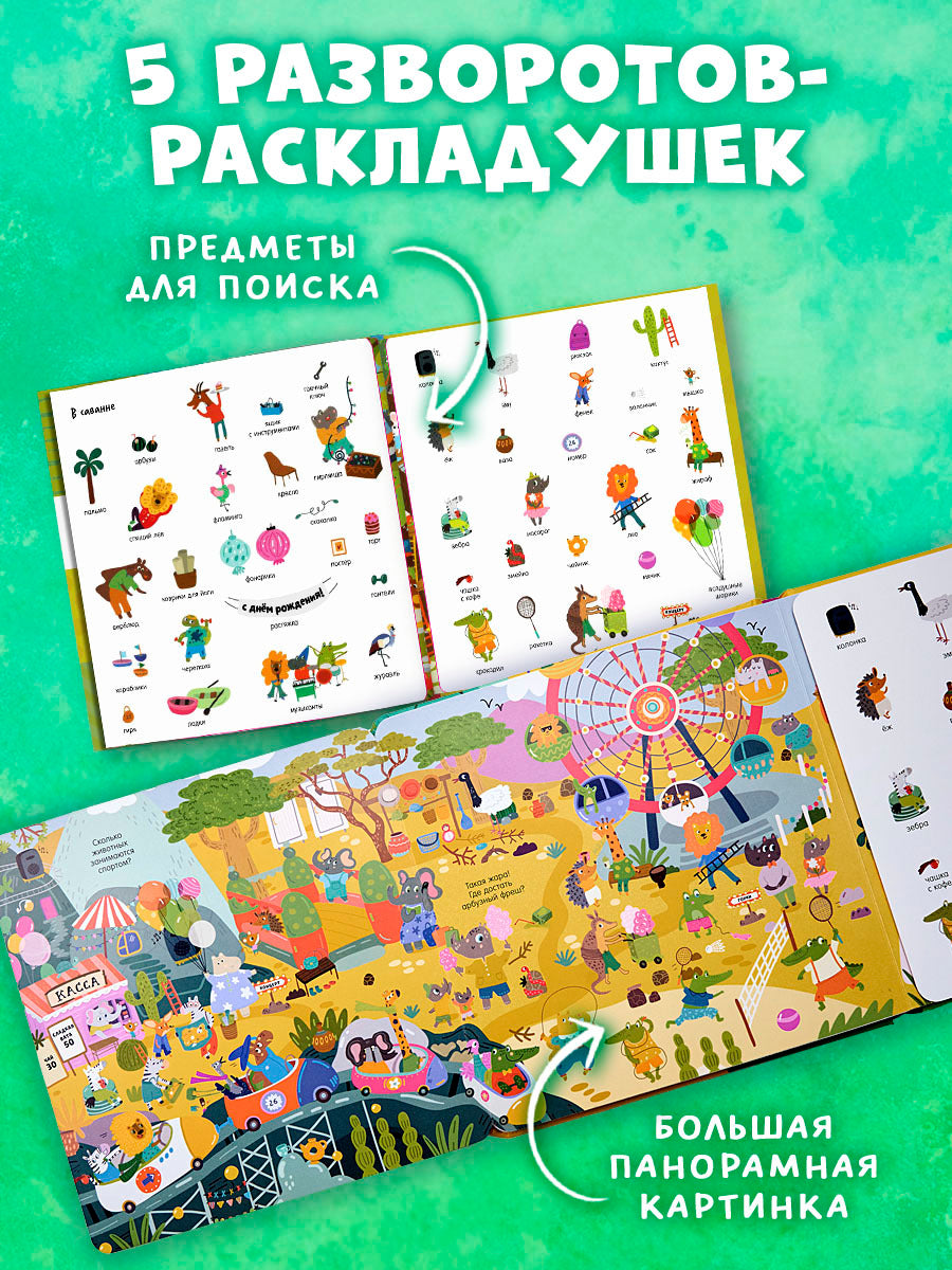 Добро пожаловать в удивительный мир животных! На страницах этой книги для детей целых пять панорамных разворотов и более 200 предметов для поиска. Вы познакомитесь с самыми разнообразными животными и узнаете, где они обитают. А еще посмеетесь, рассматривая, как в лесу лягушонок устроил чаепитие, а в саванне зебра потеряла зеленую сумочку.