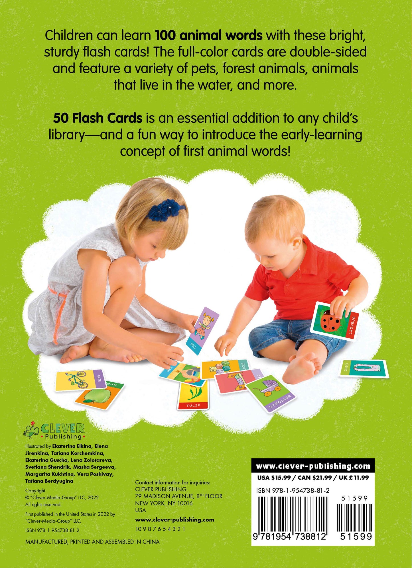 Flash cards make learning fun! Even the youngest readers can learn the names of animals with this collection of 50 bright, sturdy, double-sided flash cards for a total of 100 animals to explore. Simple illustrations and the name of the animal on each side of the card make these the perfect additional to any home library or preschool classroom. Children will meet a variety of animals from all different environments around the world, such as a bear, sloth, squirrel, penguin, polar bear, giraffe, lion, and more. For added fun, the flash cards can also be used as a simple memory game once children become confident in identifying the animal and corresponding name depicted on the card.