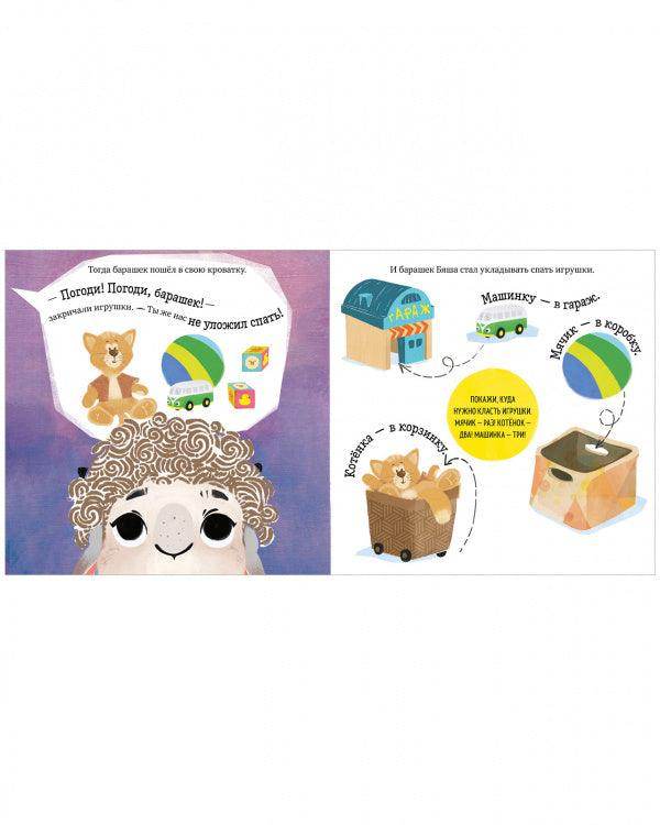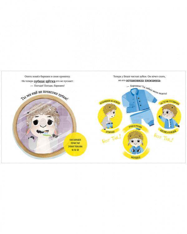 С книгой «Барашек Бяша ложится спать» можно и нужно играть: читая сказку, малыш вовлекается в сюжет книги. Он практически повторяет все действия вместе с главным героем и тем самым легко и весело учится жизненным навыкам. Взрослым не надо больше выдумывать задания по картинкам — в книге есть наводящие вопросы, написанные доступным для малыша языком.