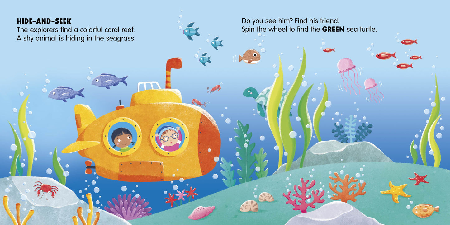 Spin the wheel and learn as you read and play! Welcome to an exciting adventure in the deep, blue sea, with Busy Colors. As two young explorers travel in their submarine, they spot ocean life in every color of the rainbow. Meanwhile, little ones are prompted to turn the wheel on every spread for a hidden surprise. They will discover a red fish, a blue whale, a green sea turtle, and more, all while helping to develop their fine motor skills. This splishsplash adventure will spark imagination, curiosity, and a growing fascination for the natural world under the sea!