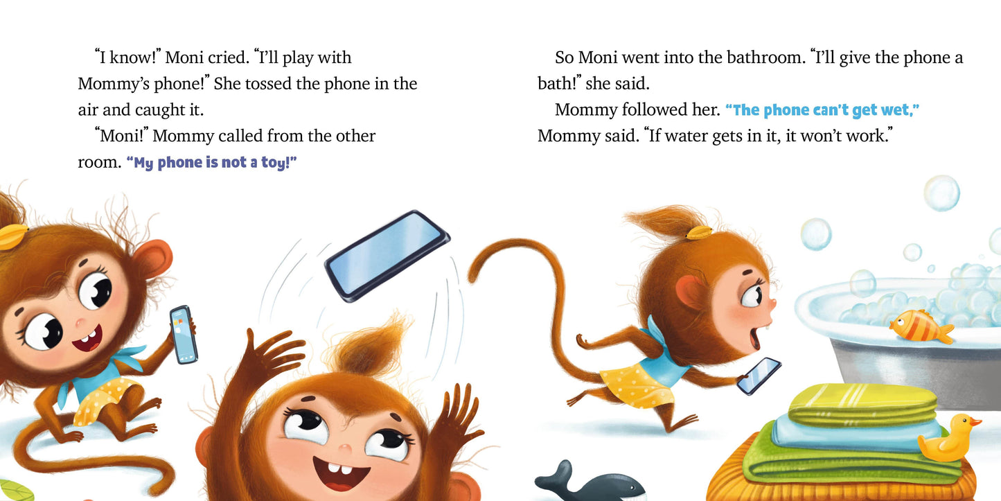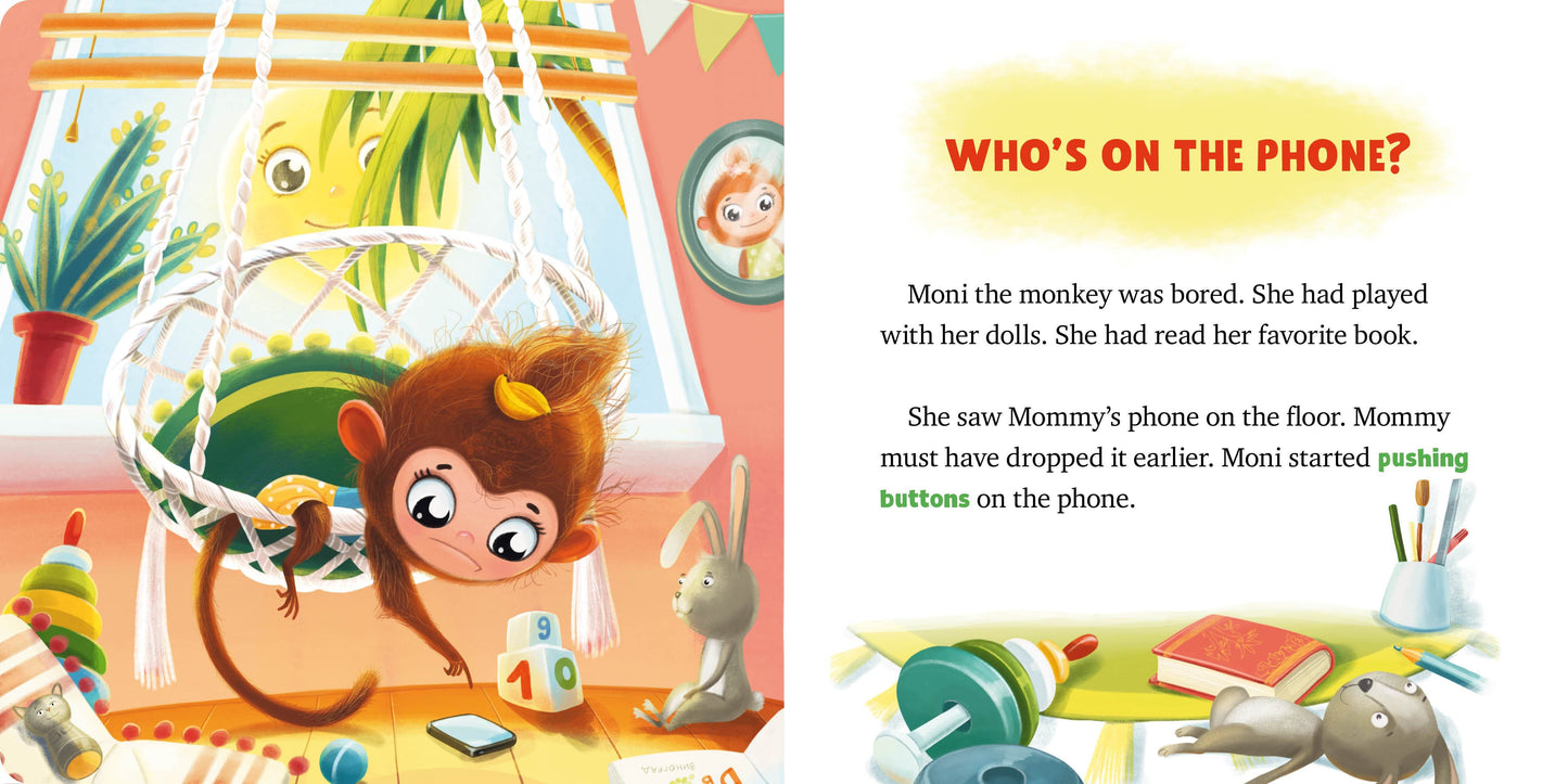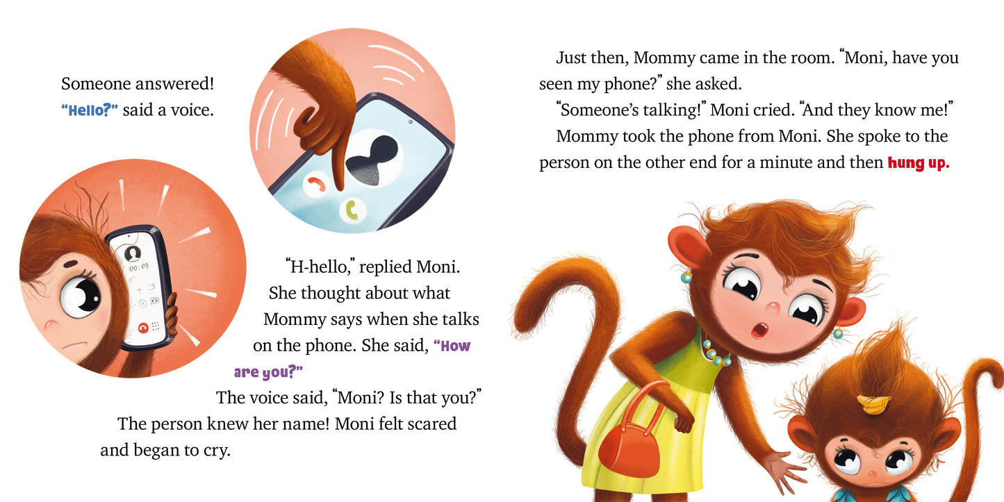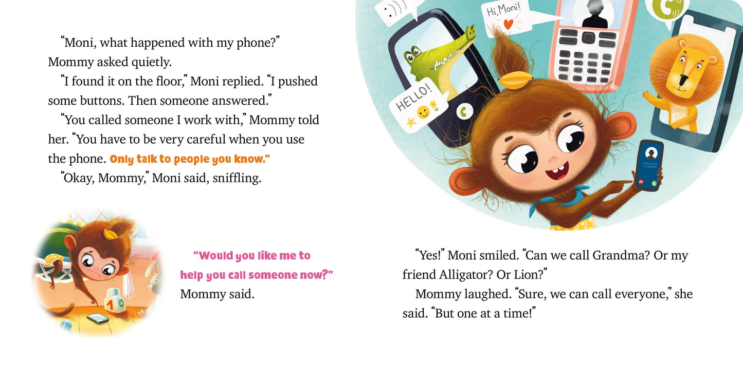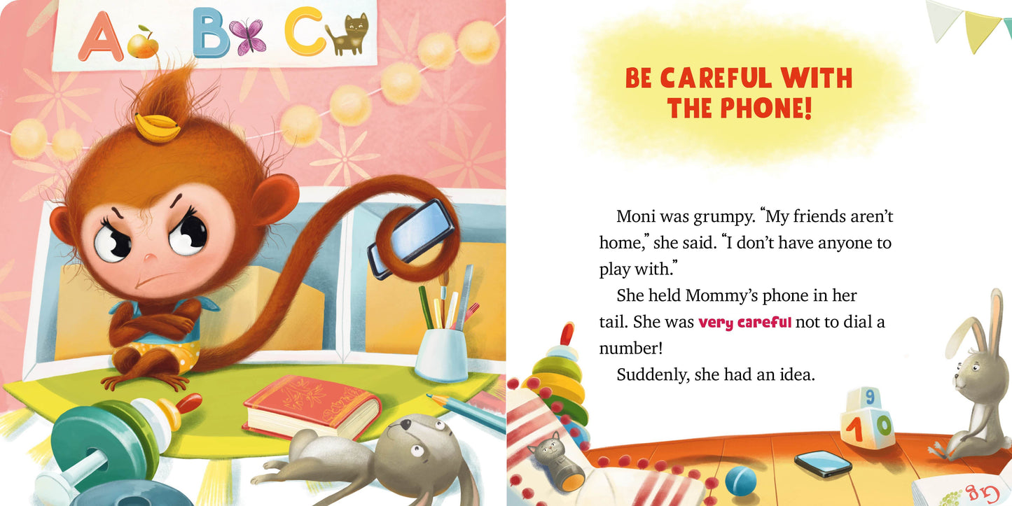 It’s never too early to teach children how to be safe! This engaging and informative board book introduces Moni, an adorable monkey, who is learning the correct way to use Mommy’s cell phone—and what not to do! Three short stories present Moni in different situations where she is allowed to use Mommy’s phone. She learns not to answer the phone if someone is calling and she doesn’t know who it is; she learns that she needs to be gentle with Mommy’s phone so that she doesn’t accidentally break it; and she learns that while it’s fun to spend time playing on Mommy’s phone, spending too much time on it isn’t a good idea because she misses out on playing with her friends.