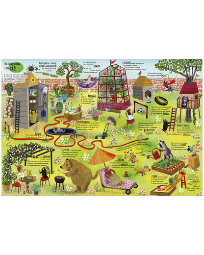 Малыша ждет увлекательное путешествие по большому дому, в котором хранятся сотни разных вещей и штуковин, обычных и фантастических. Изучите вместе с ребенком гостиную, осмотритесь в кухне и гараже, прогуляйтесь по садику, загляните в ванную и в спальню, побывайте в детской, на чердаке и напоследок в библиотеке, где ждет целый сказочный мир.