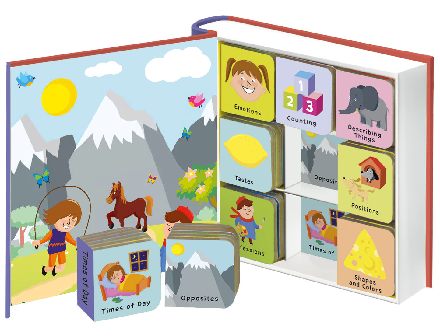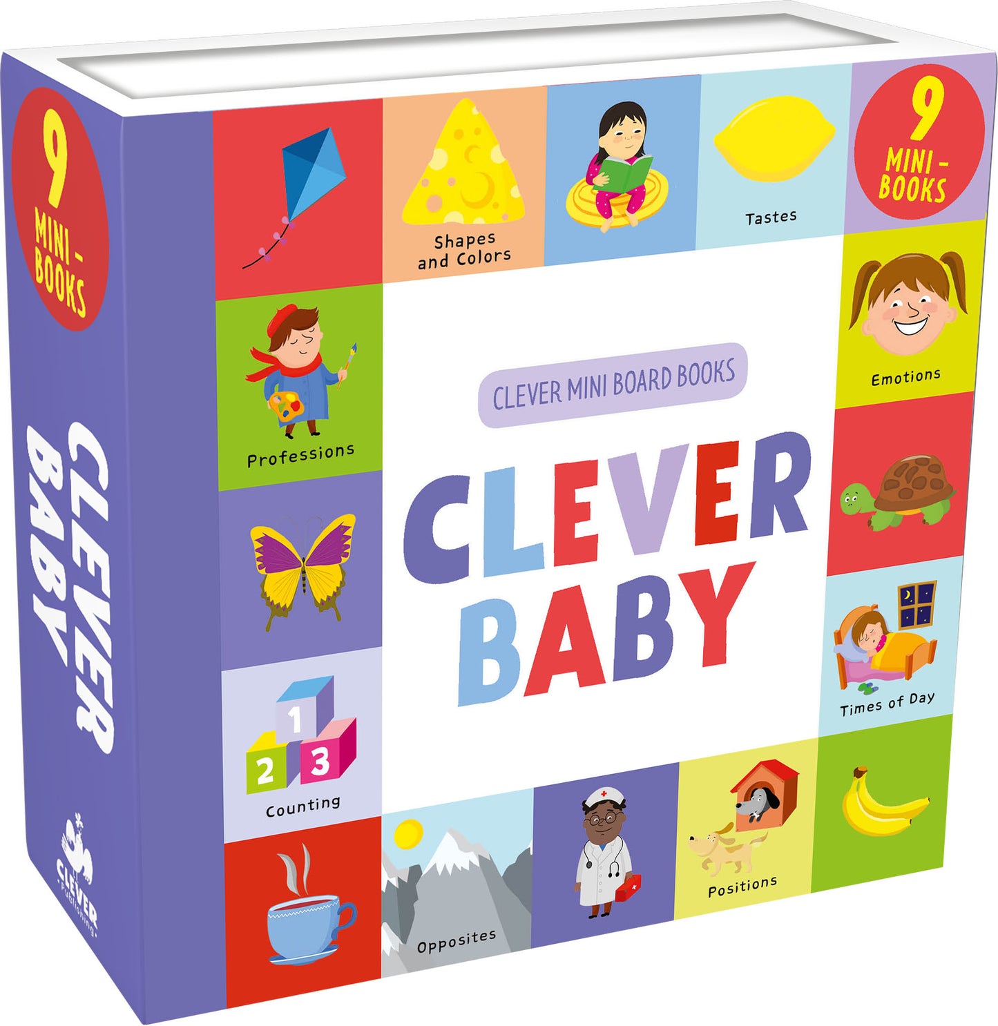 Clever Mini Board Books: Clever Baby features 9 books inside a sturdy gift package that looks like a giant book. Each mini book has a matching compartment, so toddlers know where to put the books when they're done. The books in this package include Emotions, Counting, Describing Things, Tastes, Opposites, Positions, Professions, Times of Day, and Shapes and Colors. These adorable, graspable basic concept books are fun to look at as well as play with, as toddlers will not only read along but will also stack, sort, count, and match the books. Perfect for little hands and growing minds!