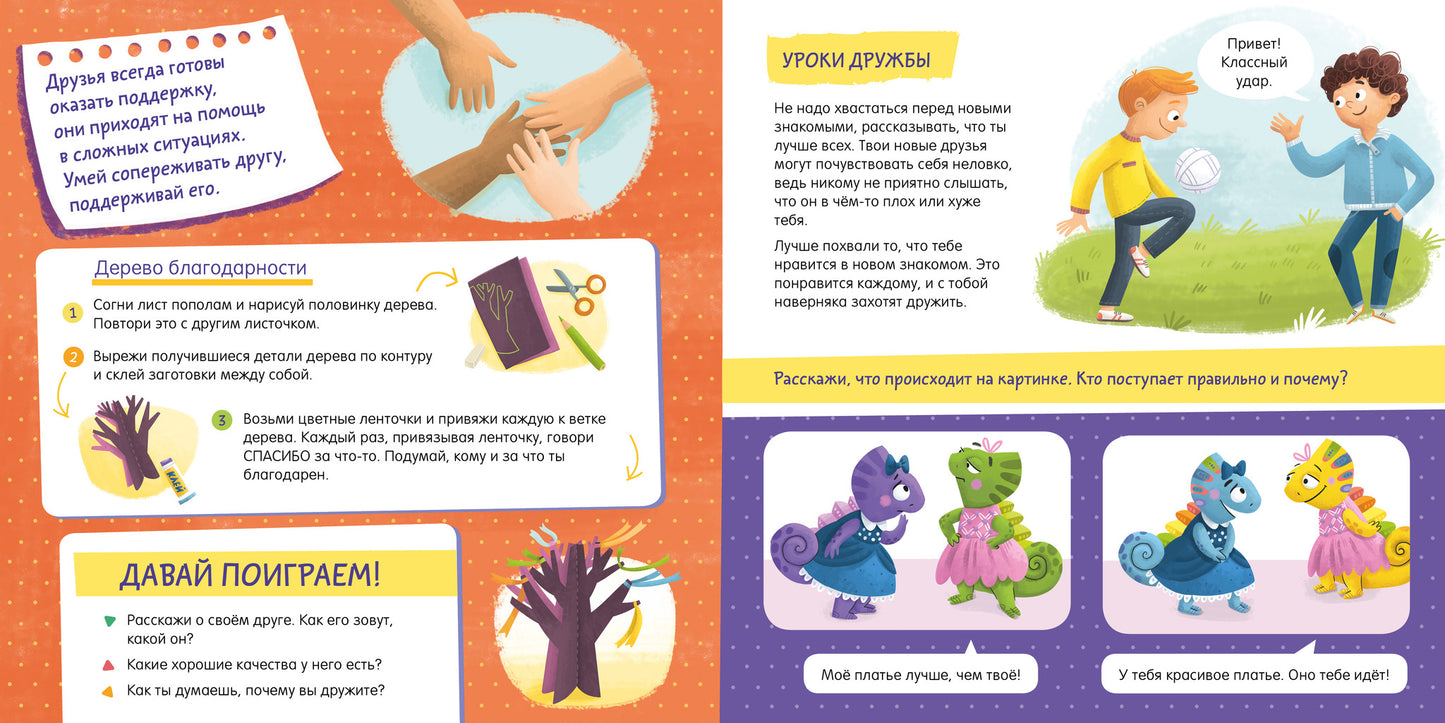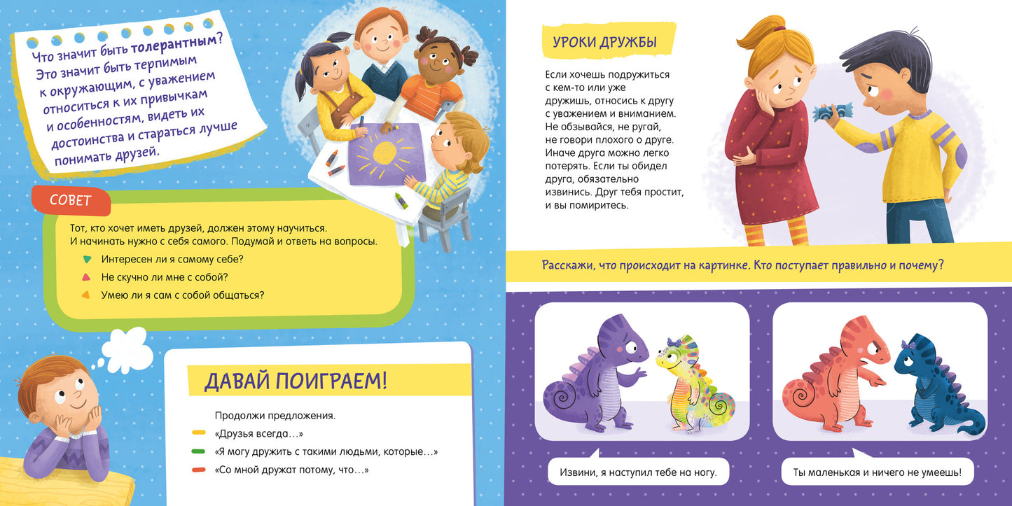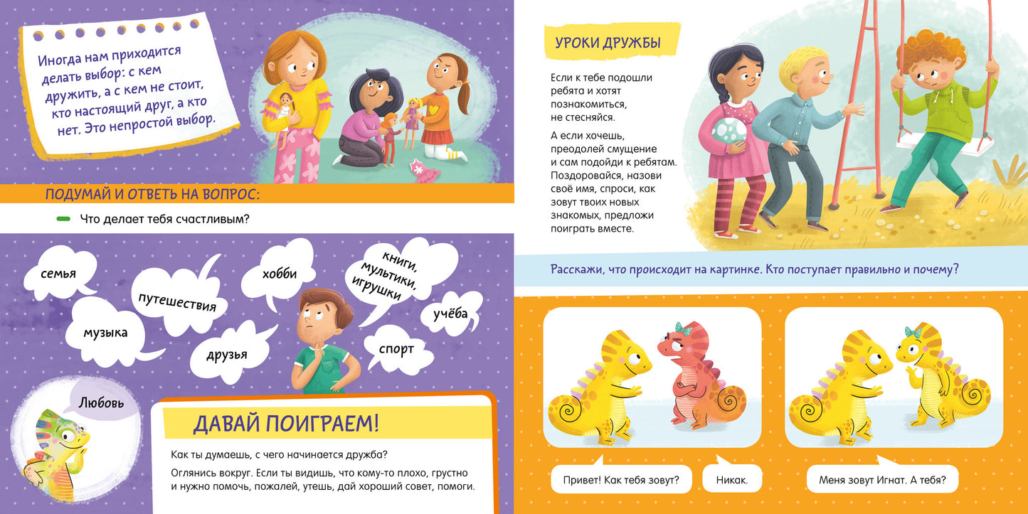 С этой книгой ребенок сможет научиться различать и понимать эмоции окружающих, будет тренироваться выстраивать диалог правильно. С помощью сказки про хамелеона Игната, который меняет цвет в зависимости от эмоции, которую он испытывает, ваш ребенок узнает, как легко и быстро установить контакт с окружающими, как говорить, чтобы тебя слушали и слышали, и какое поведение может быть обидным. Поучительные истории и психологические упражнения — советы, задания и игры — научат малыша строить отношения с окружающими, жить в гармонии с собой и с миром и быть счастливым!