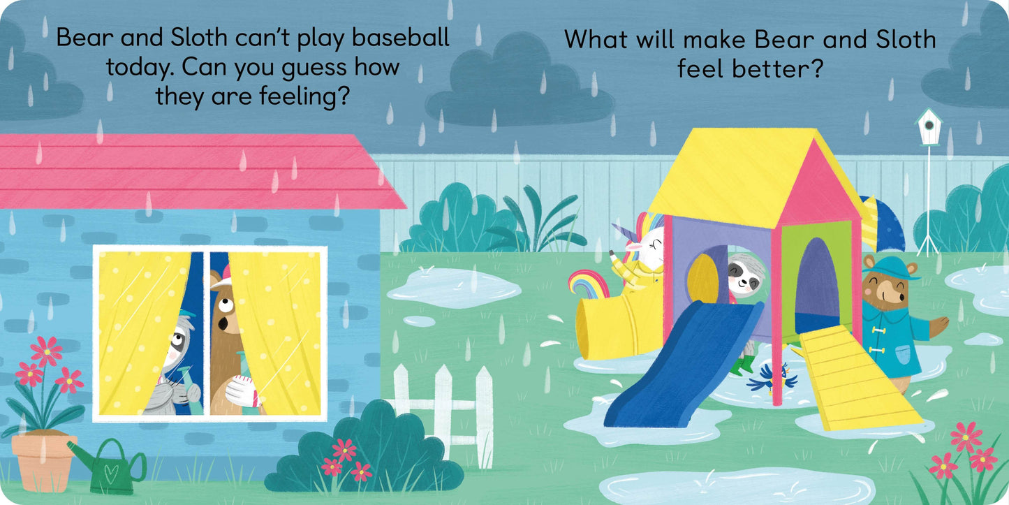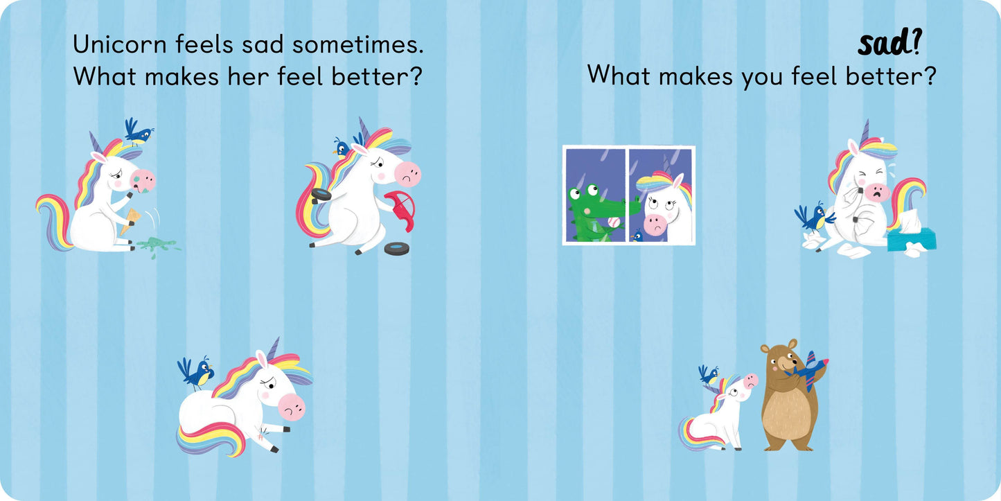 Exploring emotions and learning how to deal with them is an important part of social emotional learning for children. This sturdy board book, which features adorable artwork from the illustrator of Clever’s popular title Don’t Wake the Dragon, is part of the First Feelings collection of books from Clever. The story takes young readers along as Unicorn experiences some sad events: a broken toy; a friend getting hurt while playing; another friend dropping an icecream cone; and a day of playing baseball ruined by the rain. For each situation, young readers see the event that has led to Unicorn feeling sad, and then can lift the large flaps on every spread to see what might make Unicorn feel better. Engaging prompts on each page encourage children to try to think about why Unicorn is sad in a particular situation, and what might happen next to make her feel better. There’s even a prompt at the end of the book for young readers to think about different things that make them feel sad, and a spread full of flaps to lift.