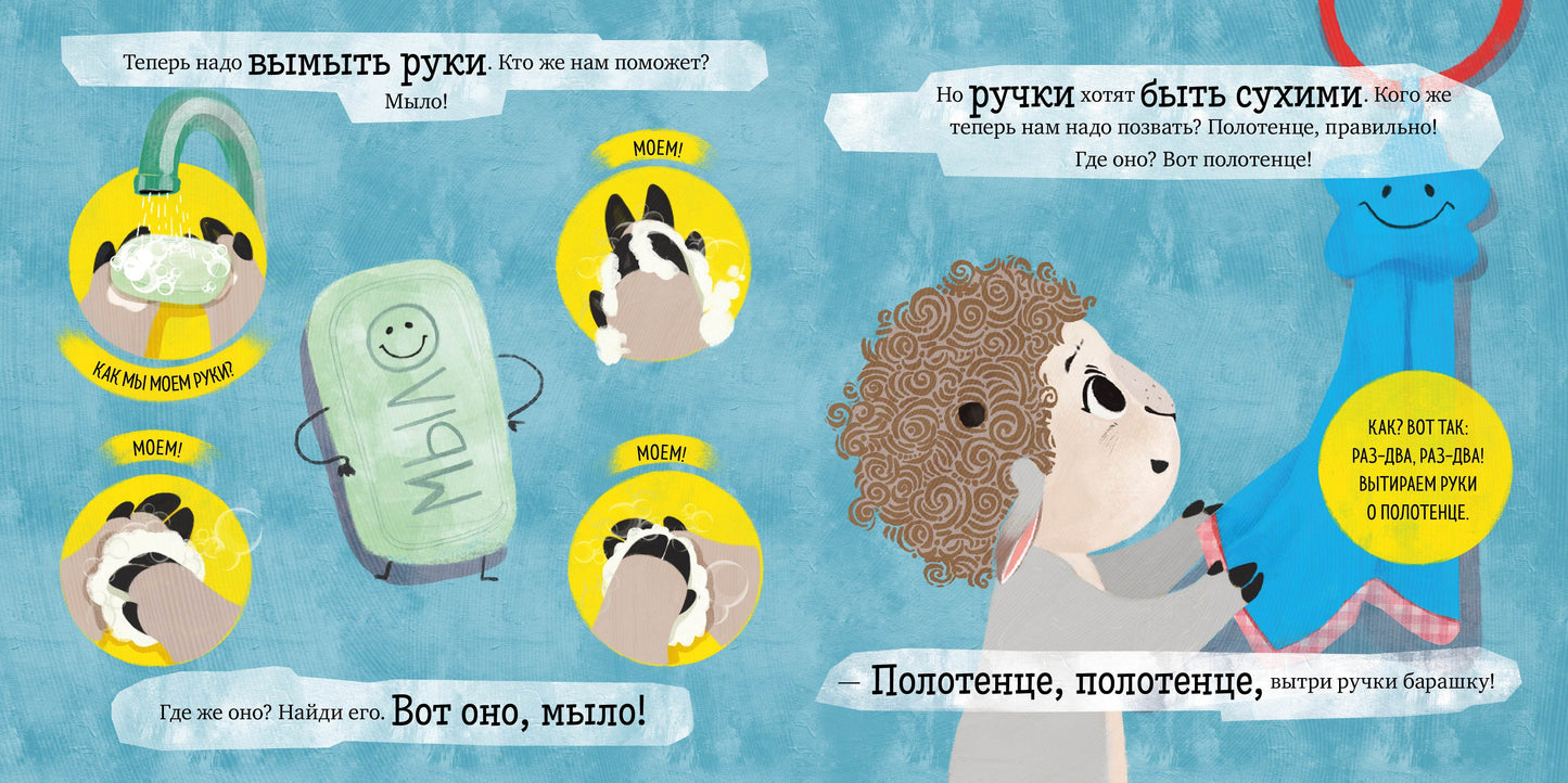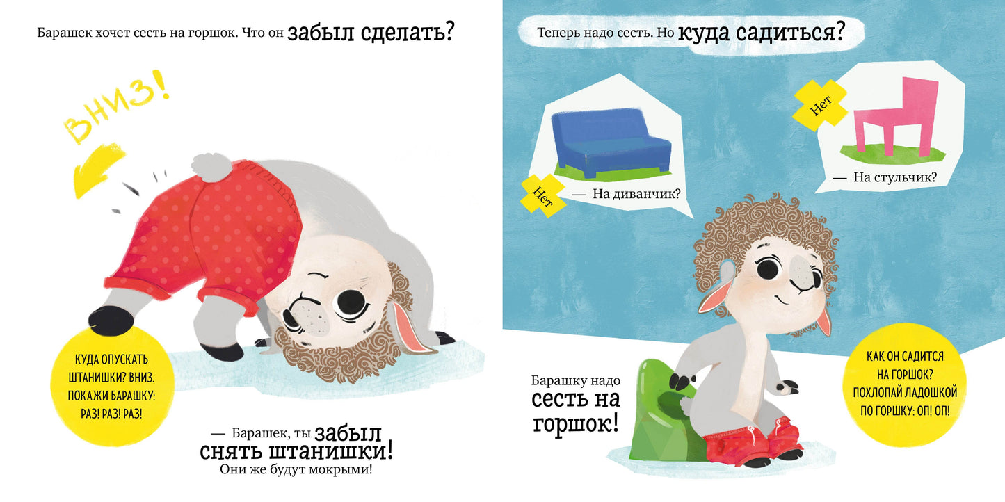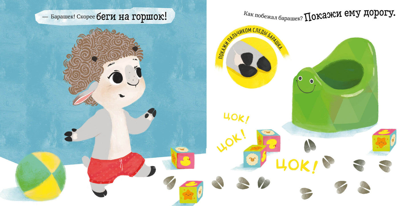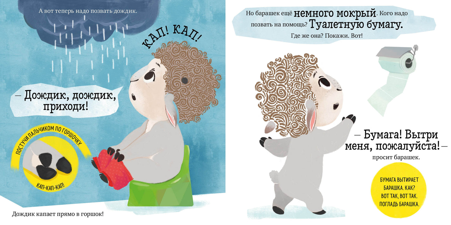Яркие интерактивные книжки-картинки для малышей с милым героем — барашком Бяшей, который только начинает познавать мир. Маленькому барашку Бяше очень трудно сменить удобный памперс на новый незнакомый предмет — горшок. Веселая книга превратит этот важный процесс в увлекательную игру. Ребенку предстоит подружиться с барашком Бяшей и помочь ему снять штанишки, воспользоваться туалетной бумагой и вымыть руки. С книгой «Барашек Бяша идет на горшок» можно и нужно играть: читая сказку, малыш вовлекается в сюжет книги. Он практически повторяет все действия вместе с главным героем и тем самым легко и весело учится жизненным навыкам. Взрослым не надо больше выдумывать задания по картинкам — в книге есть наводящие вопросы, написанные доступным для малыша языком. После прочтения сказки малыш сам будет пересказывать вам действия барашка Бяши и учить буквально всех вокруг тому, что он узнал из книги. Осторожно, вы рискуете перечитывать эту сказку много раз.