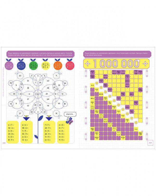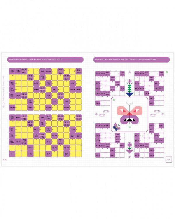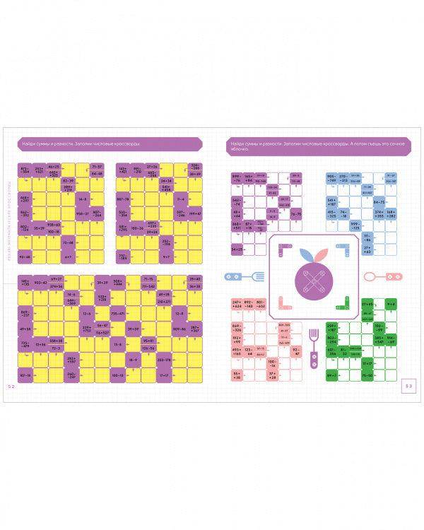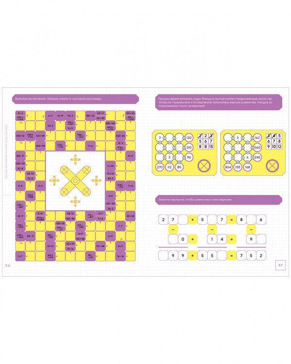 Задания будут становиться все интереснее, а примеры все сложнее, это настоящее математическое приключение. В книге 4 тематических раздела: «Тренируемся вычислять», «Математические кроссворды», «Быстрый счет» и «Комбинаторные задачи». В каждом примерно по 30 заданий, в конце книге есть раскраска и завершение истории Плюса и Циферки.