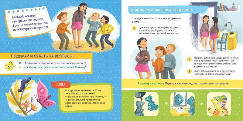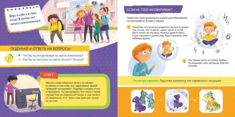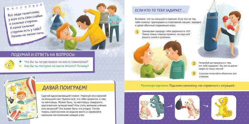 С этой книгой ваш ребенок научится справляться с агрессией окружающих, с ситуациями, когда оказался в новом и незнакомом для себя окружении, когда ты не такой, как все, и выделяешься на фоне остальных. С помощью сказки про хамелеона Игната, который меняет цвет в зависимости от эмоции, которую он испытывает, ваш ребенок узнает, как легко и быстро установить контакт с окружающими, как говорить, чтобы тебя слушали и слышали, что такое уроки доброты и толерантности. Поучительные истории и психологические упражнения — советы, задания и игры — научат малыша строить отношения с окружающими, жить в гармонии с собой и с миром и быть счастливым!