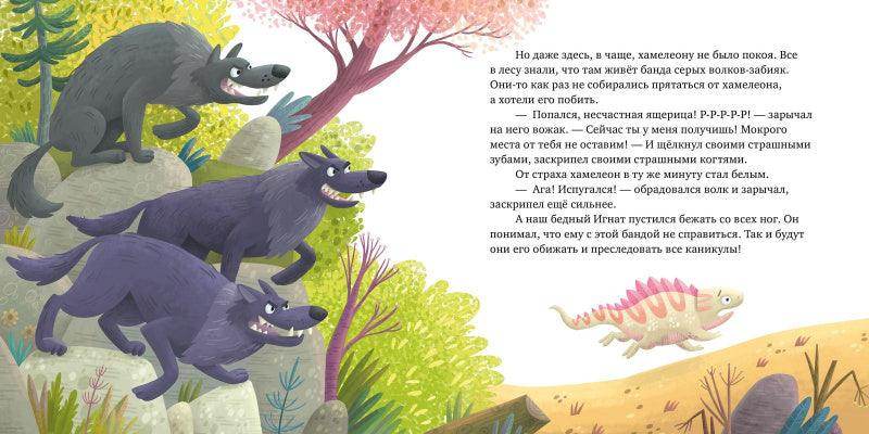 Эта яркая и красочная книга познакомит ребенка с добродушным и слегка наивным хамелеоном Игнатом. В этот раз Игнат уезжает к бабушке на каникулы и становится объектом буллинга и насмешек со стороны своих новых «друзей». Он не понимает, из-за чего это происходит и что послужило причиной.