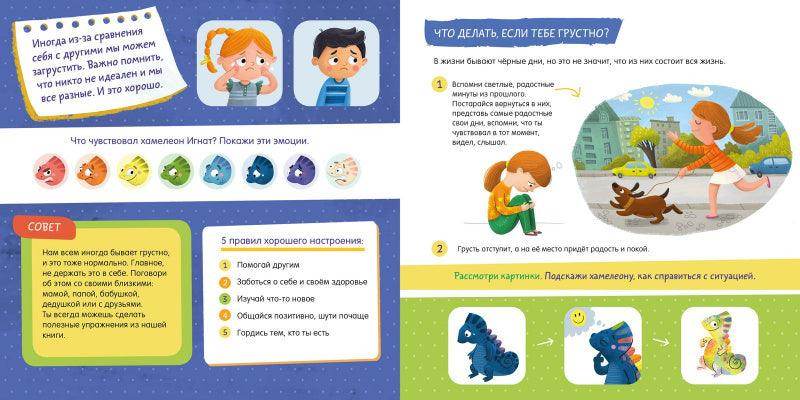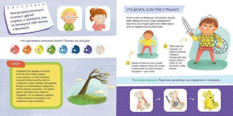 Эта яркая и красочная книга познакомит ребенка с добродушным и слегка наивным хамелеоном Игнатом. На примере историй про хамелеона, который меняет цвет в зависимости от разных эмоций, как раз и видно, как появляются разные эмоции — злость, обида, радость, зависть, стеснение, грусть, стыд и страх, как их контролировать, как негативные эмоции преобразовывать в позитивные. И как справиться с чрезвычайным проявлением даже позитивной эмоции. Поучительные истории и психологические упражнения — советы, задания и игры — научат малыша строить отношения с окружающими, жить в гармонии с собой и с миром и быть счастливым!