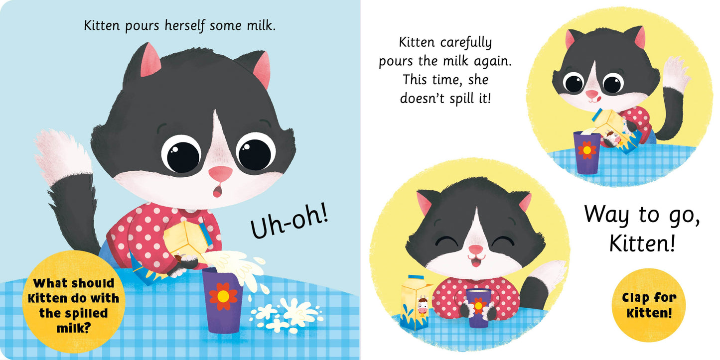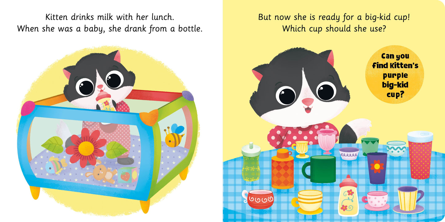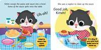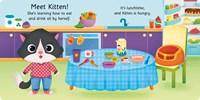 Mealtimes can be extremely trying for parents and toddlers alike, especially when a child is reluctant to try new foods. In this lighthearted and encouraging board book, Kitty is no longer a baby, so she is learning how to use a fork and a bigkid cup when it’s time to eat. She is also learning to clean up any messes that are left behind, and she’s even learning to try foods that she’s never had before. The reassuring message shows young readers that it’s fun to try new, colorful foods, and that it’s also okay to make messes, but to clean up afterward. Engaging prompts throughout the story encourage children to follow along with Kitty as they “Point to the green plate” and “Clap for Kitty for using a bigkid cup!” Bright, colorful artwork and simple text bright to life Kitty’s mealtime experience in an exciting, kidfriendly way, and a stepbystep summary at the end of the book highlights Kitty’s accomplishments and provides a simple guide for parents and their children who are new to independent eating.