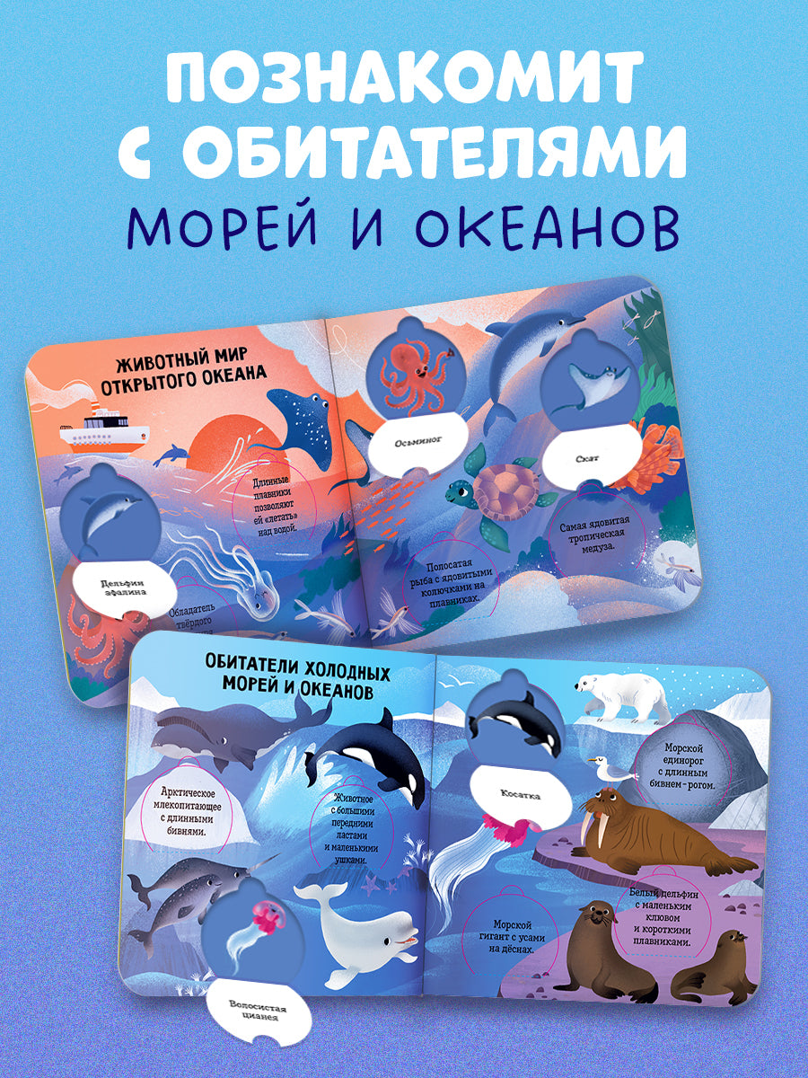 Познавательная книга с интерактивными элементами «Океаны и моря. Энциклопедия с окошками» раскроет тайны подводного мира и ответит на самые интересные вопросы любознательных почемучек.