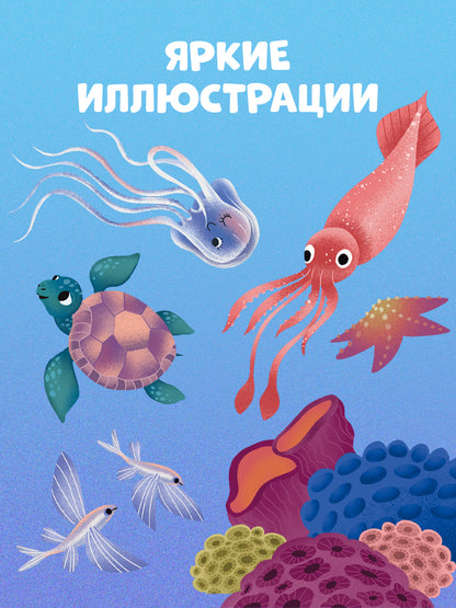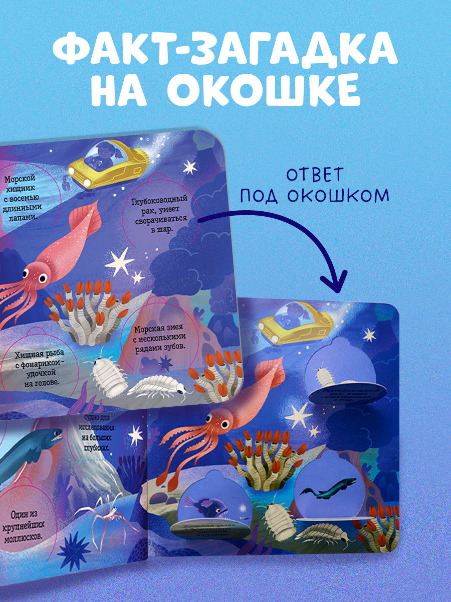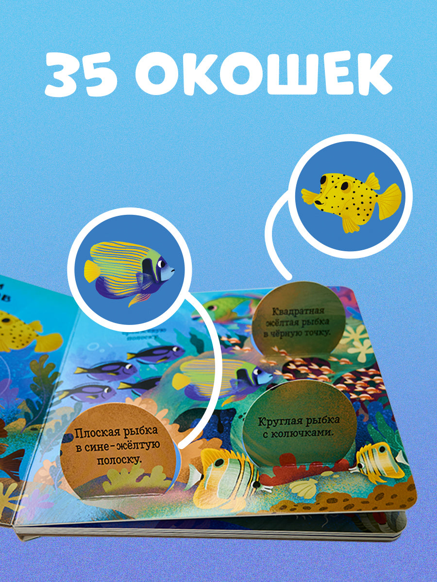 В книге пять тематических разворотов и клапаны с научными фактами-загадками, под которыми прячется картинка-ответ. Маленьких читателей ждет увлекательное путешествие к коралловым рифам, в гости к удивительным созданиям, которые притаились на дне океана, и обитателям холодных морей. Необычные морские существа, разноцветные рыбы и растения — открывайте окошки книги и узнавайте больше о самых фантастических созданиях, обитающих в воде.