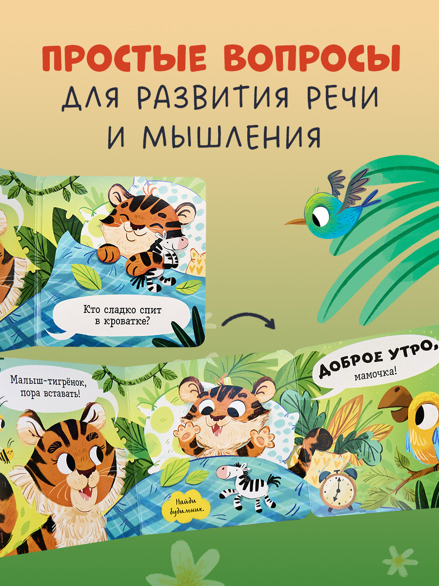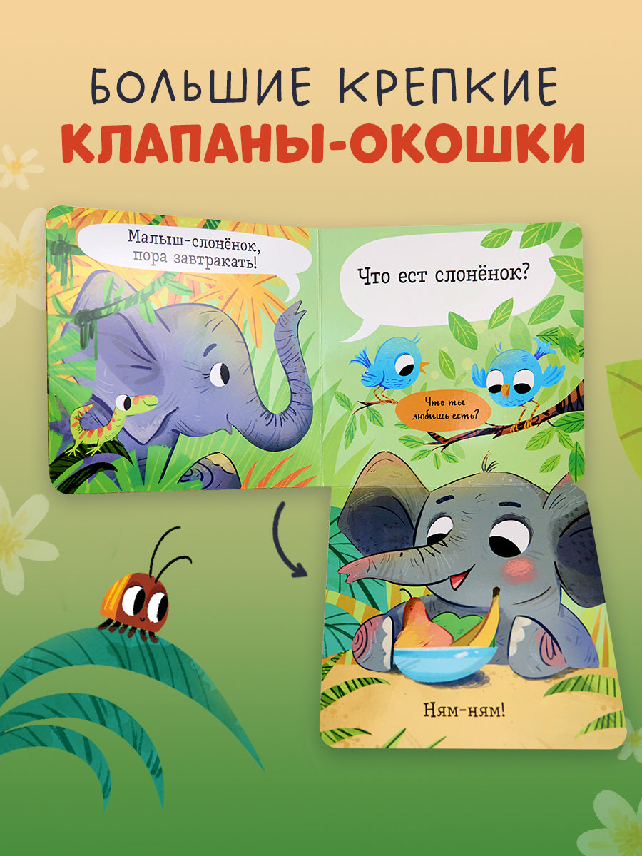 Вместе с ребенком открывайте большие клапаны-окошки и помогайте героям: тигренку нужно отыскать на картинке будильник, обезьянке — расческу, слоненку — что-то вкусное на завтрак. Можно ответить на вопросы: какого цвета одежда носорога, что съест слон? А еще порассуждать, что сам малыш любит есть на завтрак.