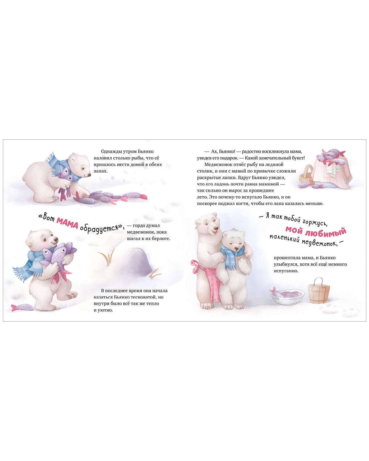 «Какая БОЛЬШАЯ лапа у мамы», — думал медвежонок Бьянко, засыпая в нежных объятиях. Проходили день за днём, неделя за неделей, малыш подрастал… И однажды он заметил, что теперь его лапка больше маминой — Бьянко стал совсем взрослым! Неужели теперь мама разлюбит своего малыша?..