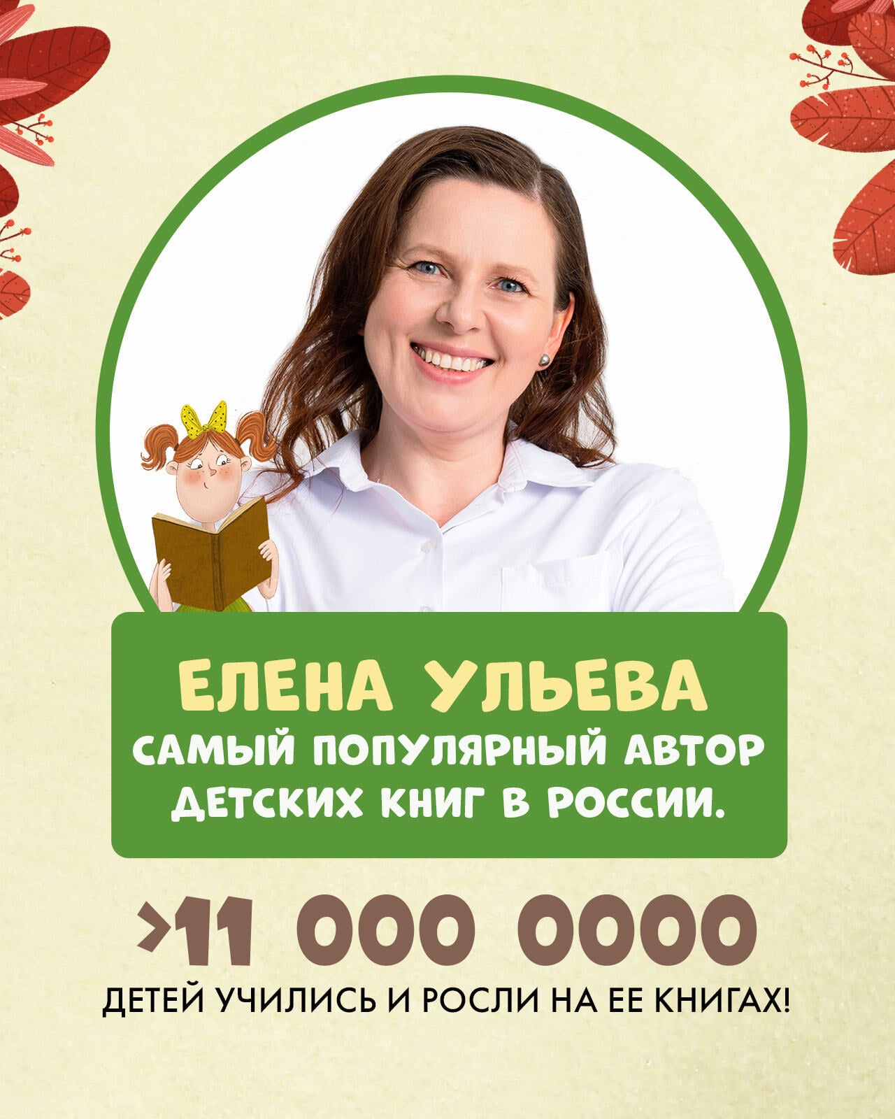 Елена Ульева — самый популярный и самый издаваемый современный российский автор детских книг. Больше 11 миллионов детей учились и росли на ее книгах. Ежегодно входит в топ-3 по суммарным тиражам среди детских авторов.