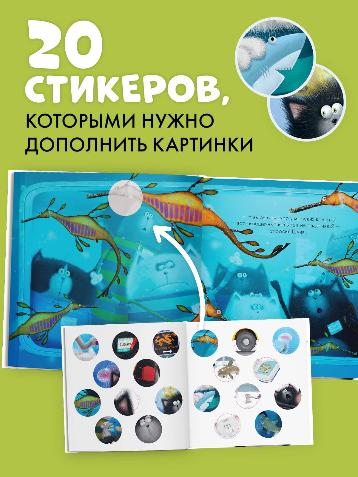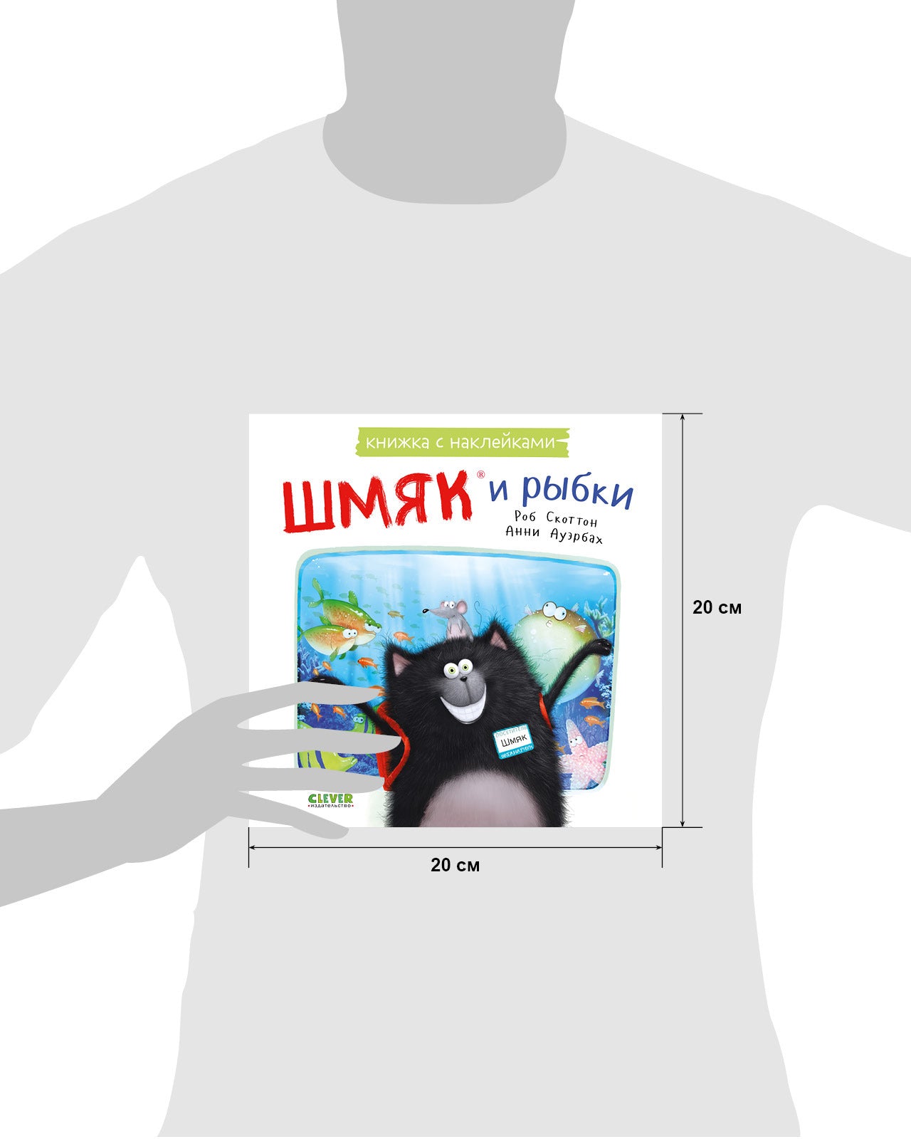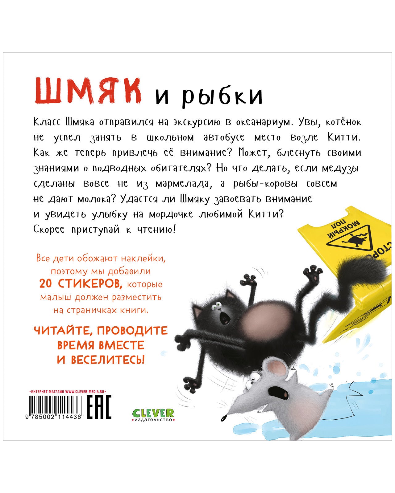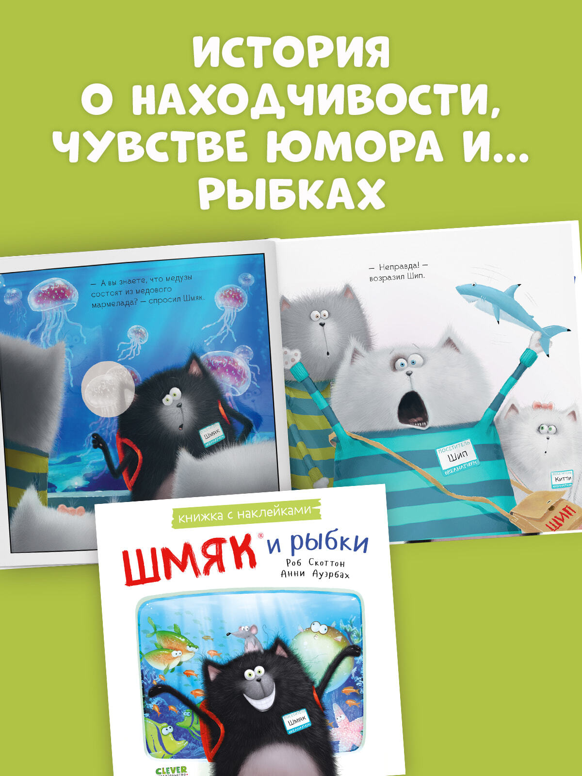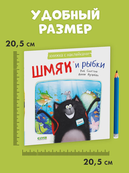 «Шмяк и рыбки. Книжка с наклейками» — это история, доказывающая: находчивость и чувство юмора иногда бывают важнее научных знаний.