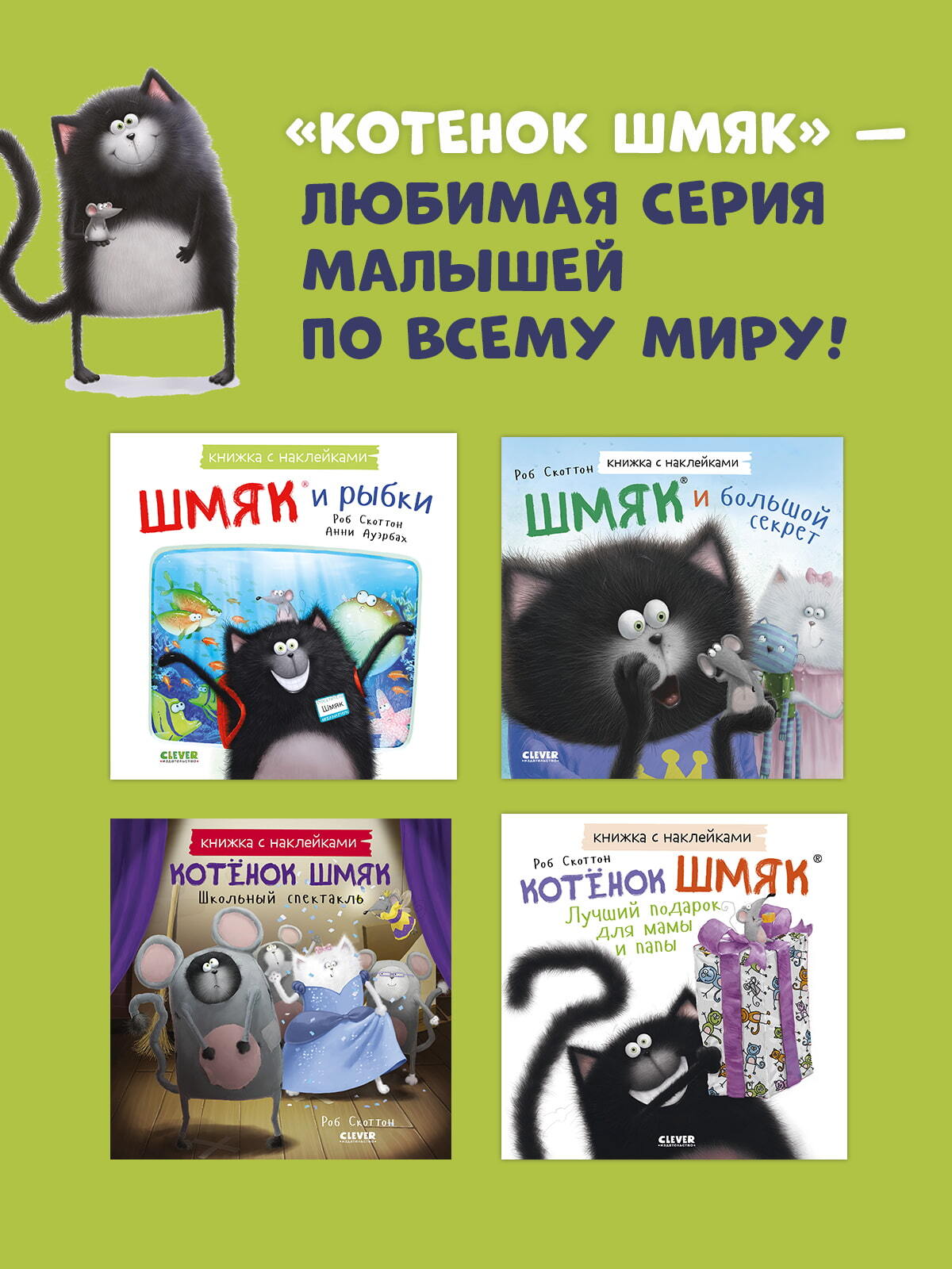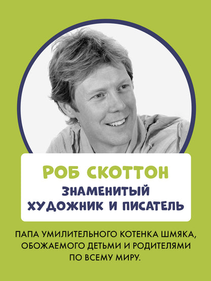 Котенка Шмяка придумал и нарисовал Роб Скоттон — знаменитый художник и писатель. Его книги про чудесного кота читают и любят во всем мире!