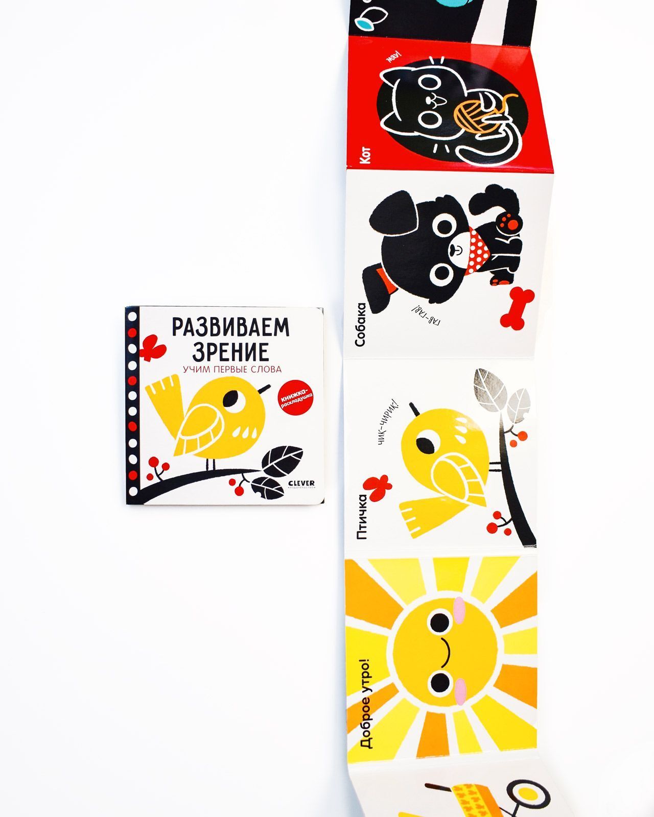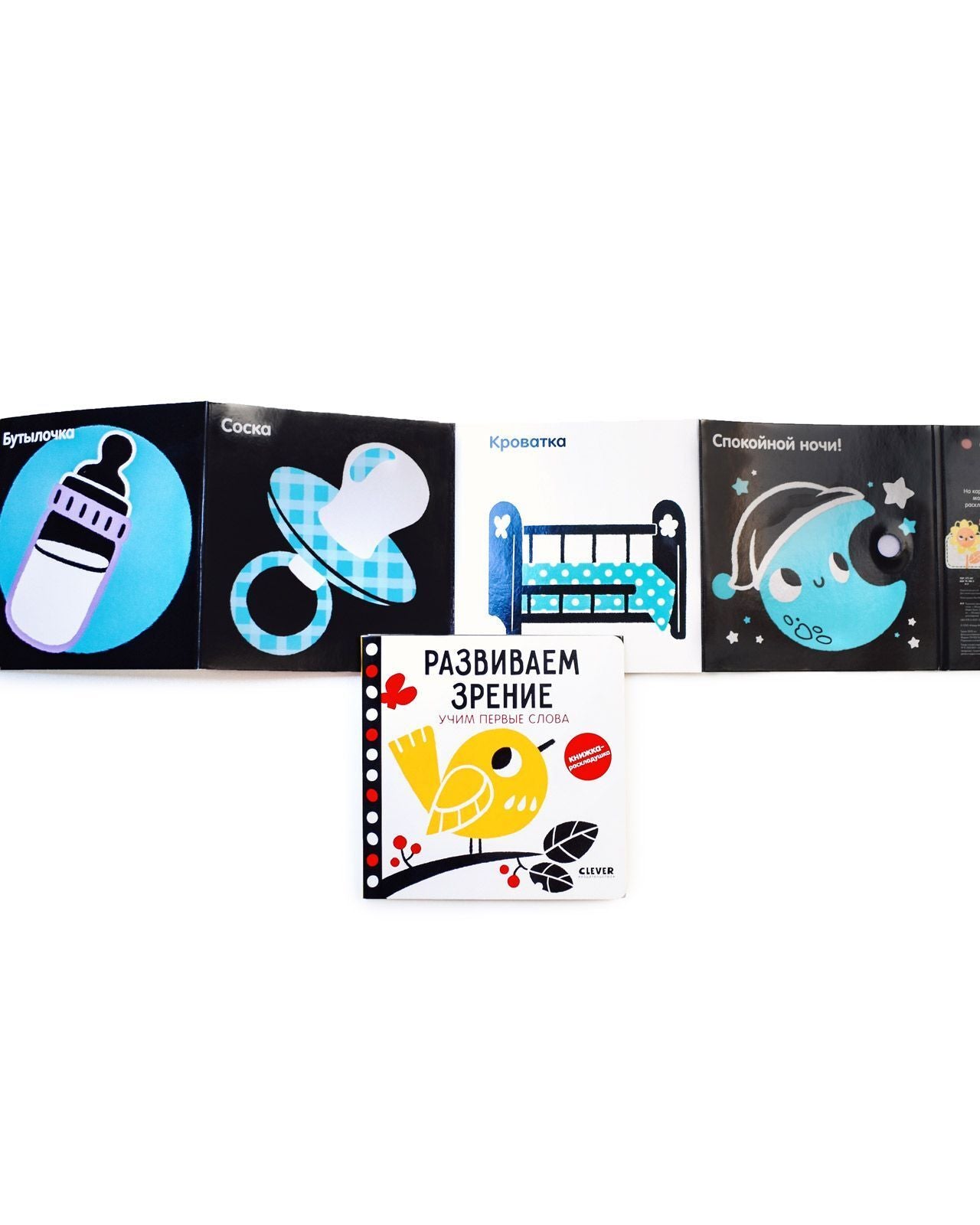 Контрастная книжка-раскладушка «Развиваем зрение. Учим первые слова» разработана на основе возрастных психологических и физиологических особенностей младенцев и популярной методики стимуляции развития зрения: