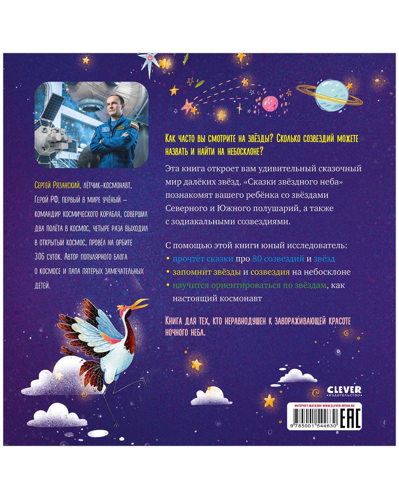 Как часто вы смотрите на звезды? Сколько созвездий можете назвать и найти на небосклоне? Эта книга откроет вам удивительный сказочный мир далеких звезд. Книга «Сказки звездного неба» познакомят вашего ребенка со звездами Северного и Южного полушарий. Особое место в книге занимают сказки о зодиакальных созвездиях. В каждой сказке юный исследователь познакомится с забавными добрыми героями, которые помогут ему найти и запомнить нужные звёзды и созвездия на небосклоне, а также научат ориентироваться по звёздам так, как это делают настоящие космонавты. Это не просто сказки, а книга-игра «Как стать настоящим космонавтом». Прочитав забавную сказку о жителях звездного неба, вы можете закрепить новую информацию, отыскав на специальном развороте (почти настоящей карте звездного неба) это созвездие или звезду, посмотреть, какие у него «соседи», и запомнить его расположение на ночном небе. «Изучить звездное небо — значит, сделать первый шаг на пути к стремлению освоить космос, познать другие галактики. Пусть „Сказки звездного неба“ станут для тебя захватывающим приключением и настоящим путешествием к звездам!» Ваш автор Сергей Рязанский, Герой РФ, летчик-космонавт Книга «Сказки звездного неба» познакомит вашего ребенка с удивительными созвездиями и научит с легкостью находить их на небосводе. Ведь каждый в душе желает покорить звездное пространство и отправиться в космическое путешествие навстречу неизведанному. В основу книги «Сказки звездного неба» легла методика изучения звездного неба, которую специально для космонавтов разработал ведущий инженер Центра подготовки космонавтов Анатолий Чигиринов. Звездное небо — навигатор для космонавтов. Его знание играет важную роль в космосе. Чтобы безошибочно ориентироваться в пространстве вне зависимости от положения небесной сферы и оперативно решать задачи навигации в условиях ограниченного поля зрения, экипаж космического корабля должен твердо знать звездную карту, уметь свободно определять основные навигационные созвездия и уверенно находить опорные звезды. Книга для тех, кто неравнодушен к завораживающей красоте ночного неба. Сергей Рязанский — летчик-космонавт, Герой РФ, первый в мире ученый — командир космического корабля, совершил два полета в космос, четыре раза выходил в открытый космос, провел на орбите 306 суток, автор популярного блога о космосе и папа четверых очаровательных детей.