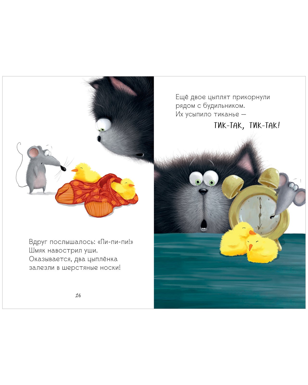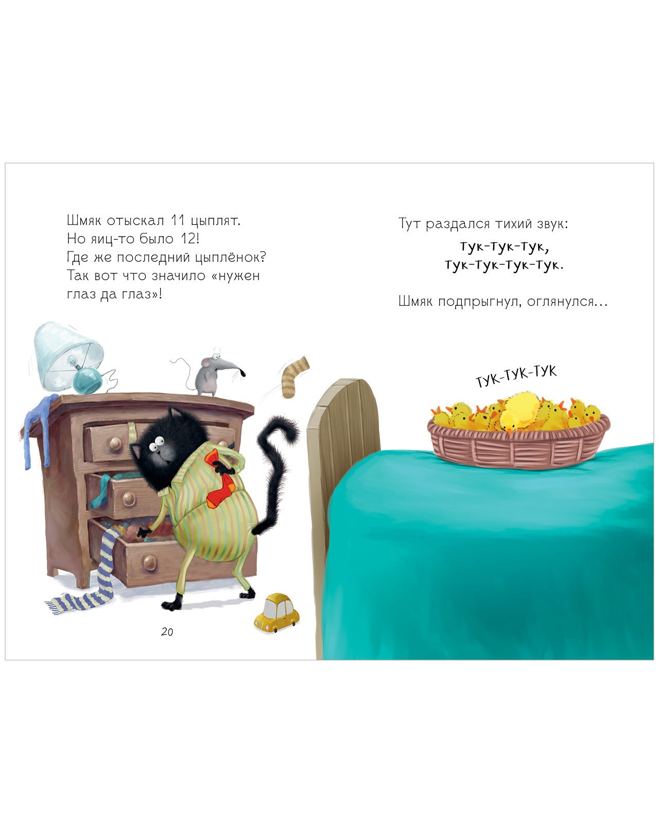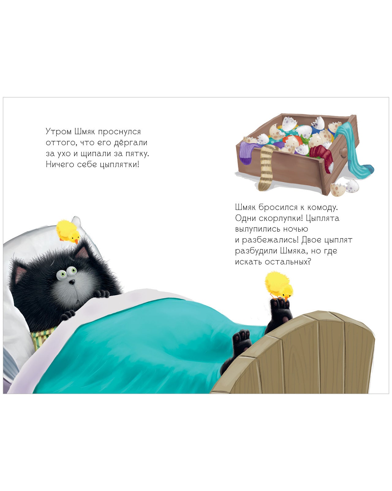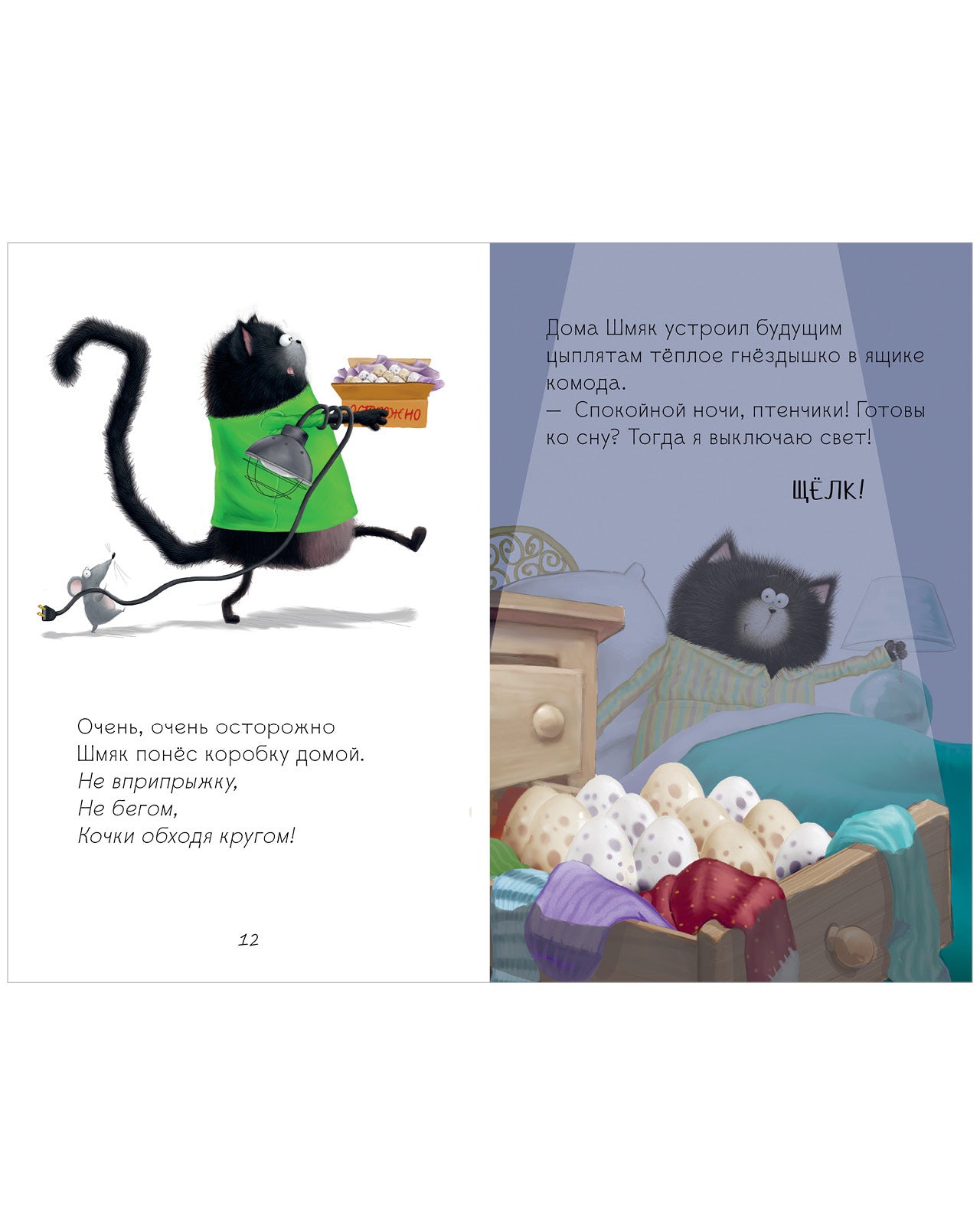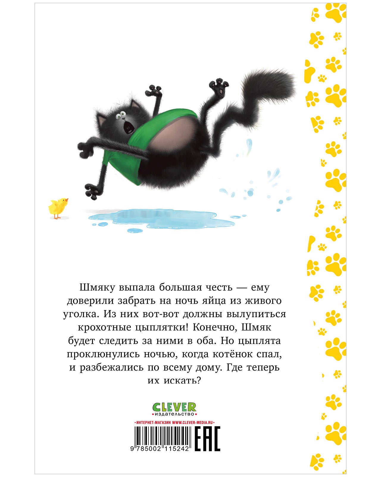 Шмяку выпала большая честь - ему доверили забрать на ночь яйца из живого уголка. Из них вот-вот должны вылупиться крохотные цыплятки! Конечно, Шмяк будет следить за ними в оба. Но цыплята проклюнулись ночью, когда котёнок спал, и разбежались по всему дому. Где теперь их искать?