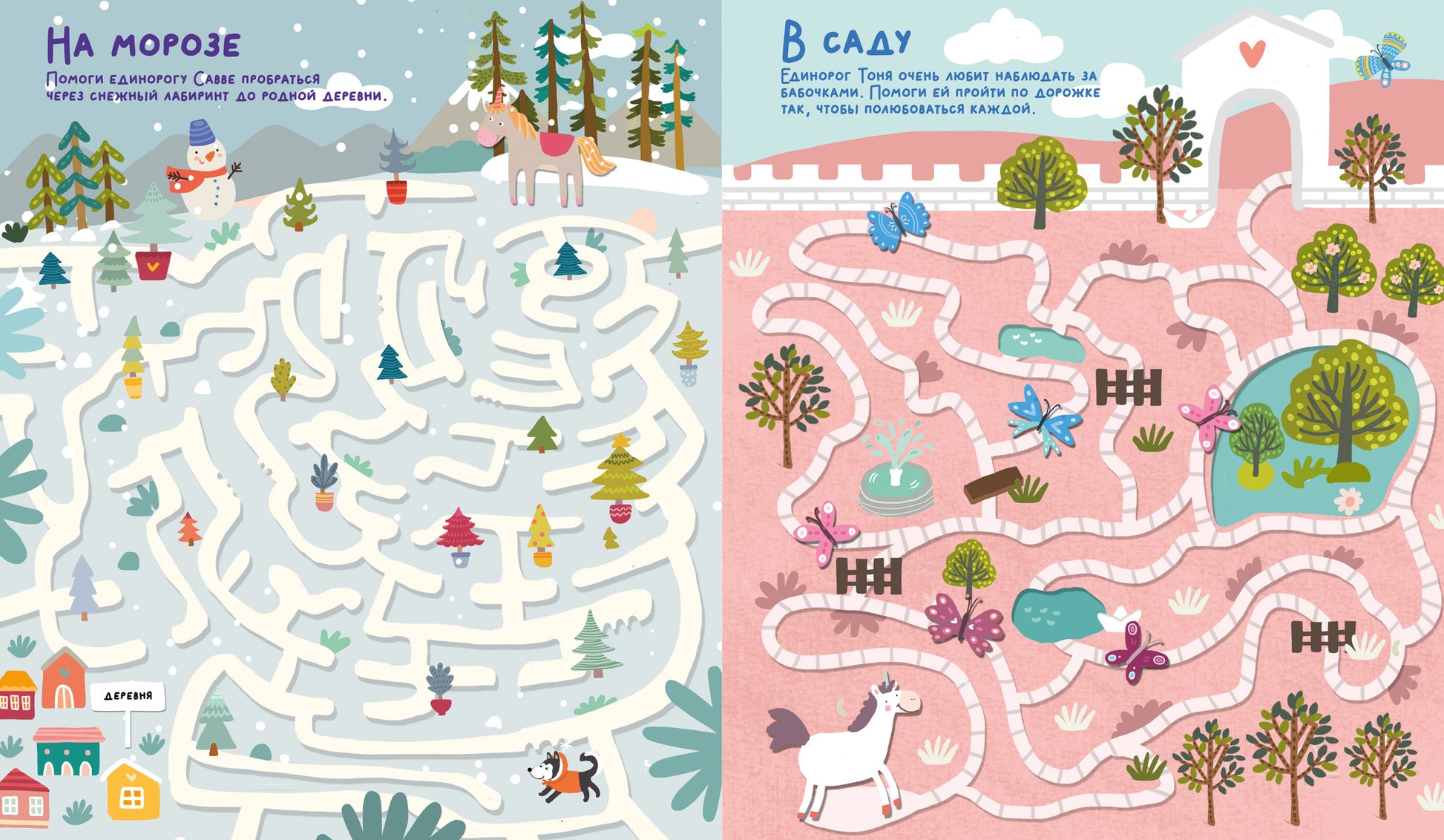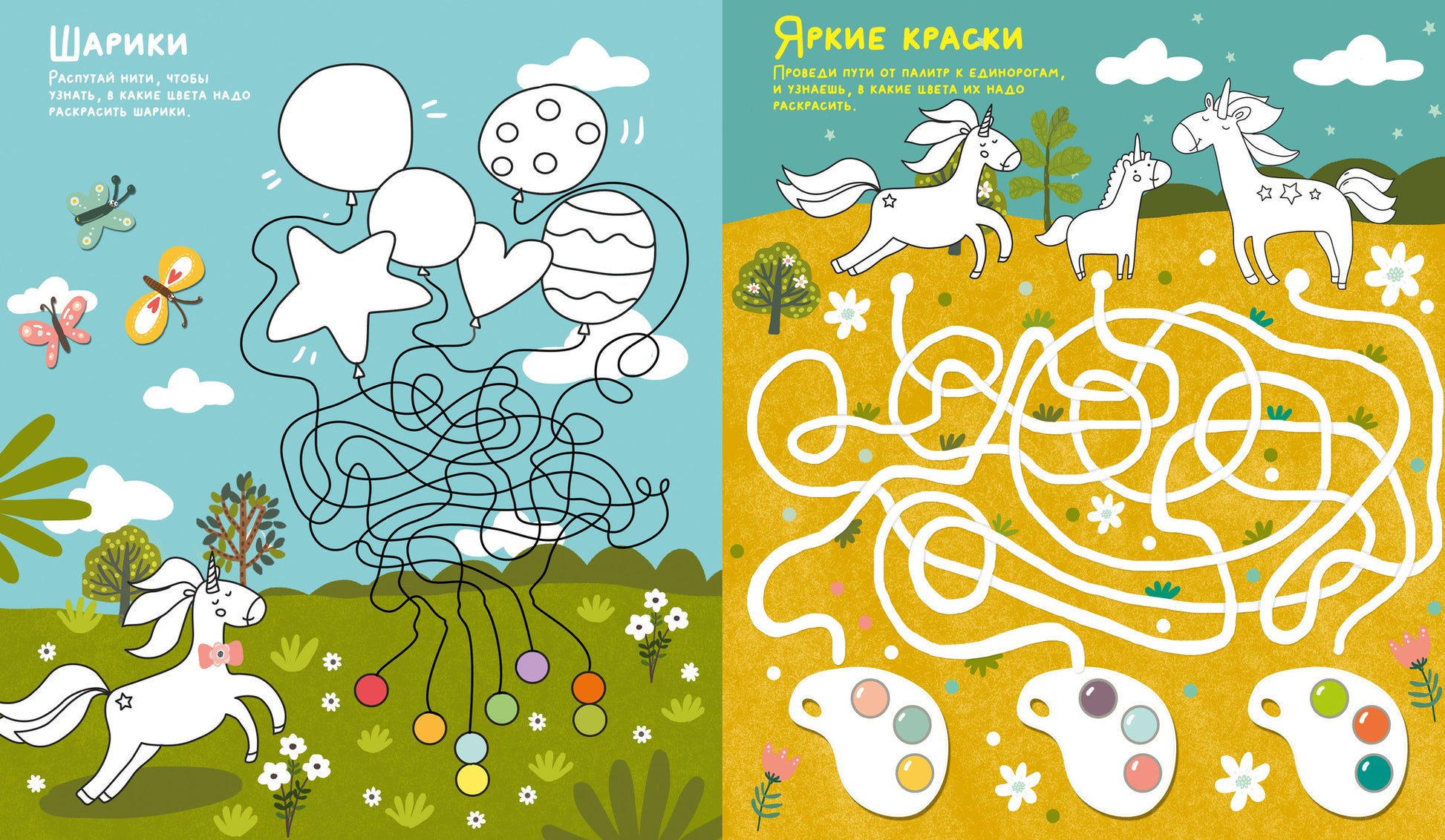 По бродилкам и лабиринтам вы дойдёте до волшебных садов, побываете в замках и покатаетесь с весёлыми единорогами на радуге. Вам понадобятся цветные карандаши или фломастеры, чтобы устроить небольшое соревнование на ловкость и сообразительность! Вперёд!