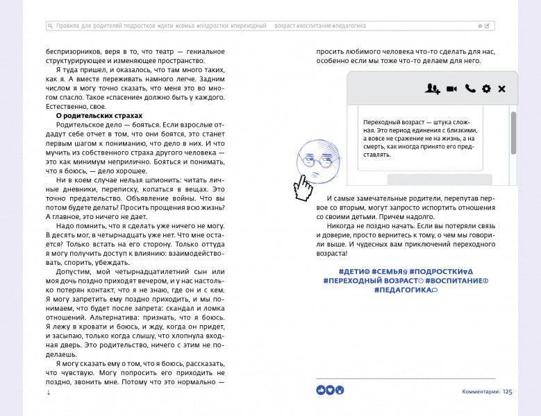 Книга «Любить нельзя воспитывать» построена по принципу фейсбучного блога, ее можно читать с любого места. В каждом посте — родительские привычки, сомнения и страхи, в которых мы сами не всегда себе признаемся. Здесь есть все, чтобы выйти за рамки привычной рутины в отношениях с детьми и не повторять ошибок своих родителей.