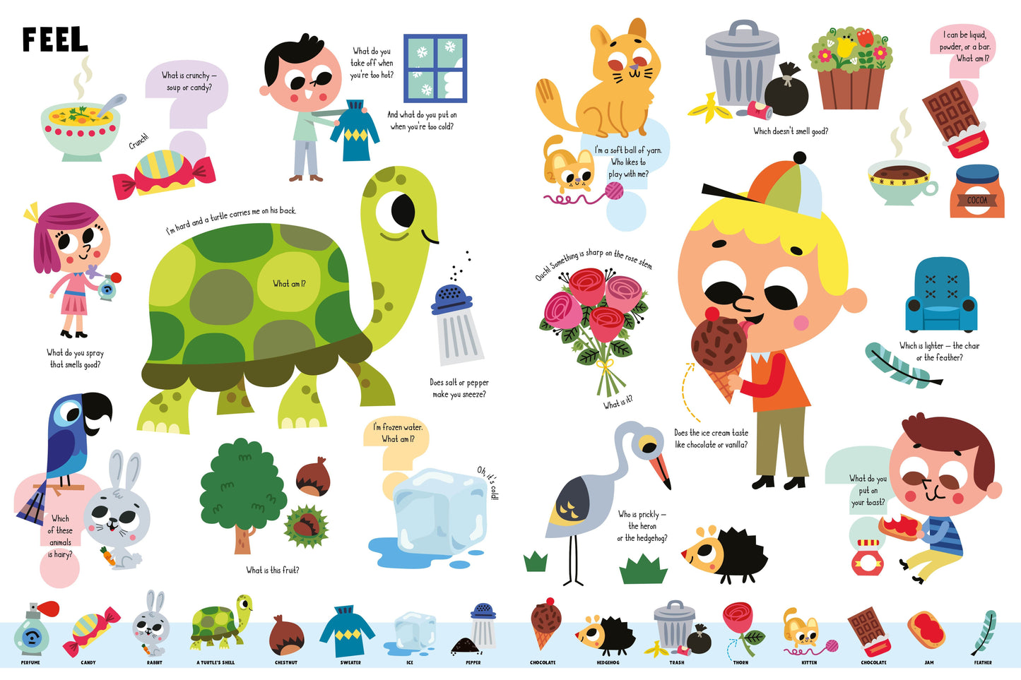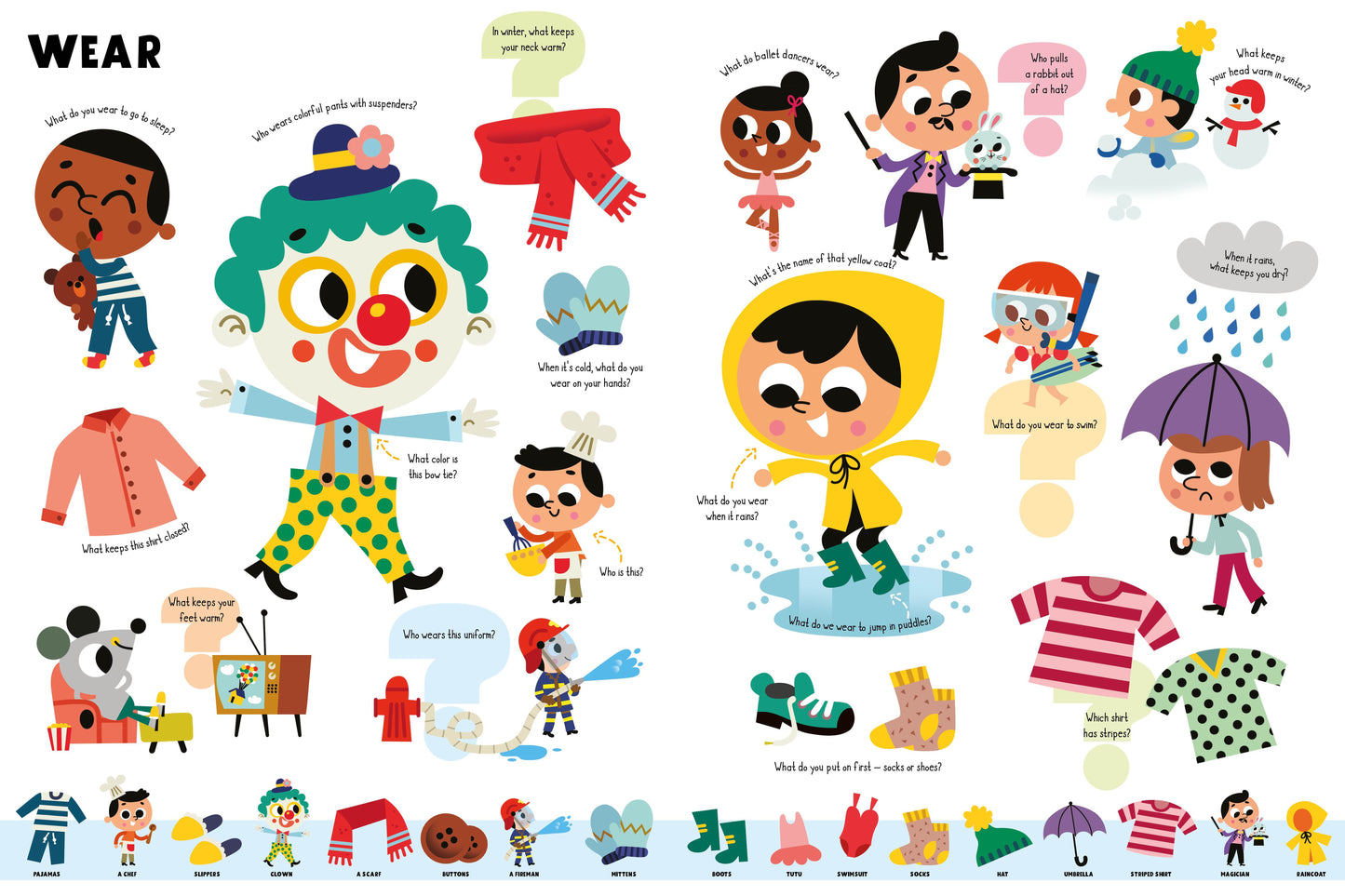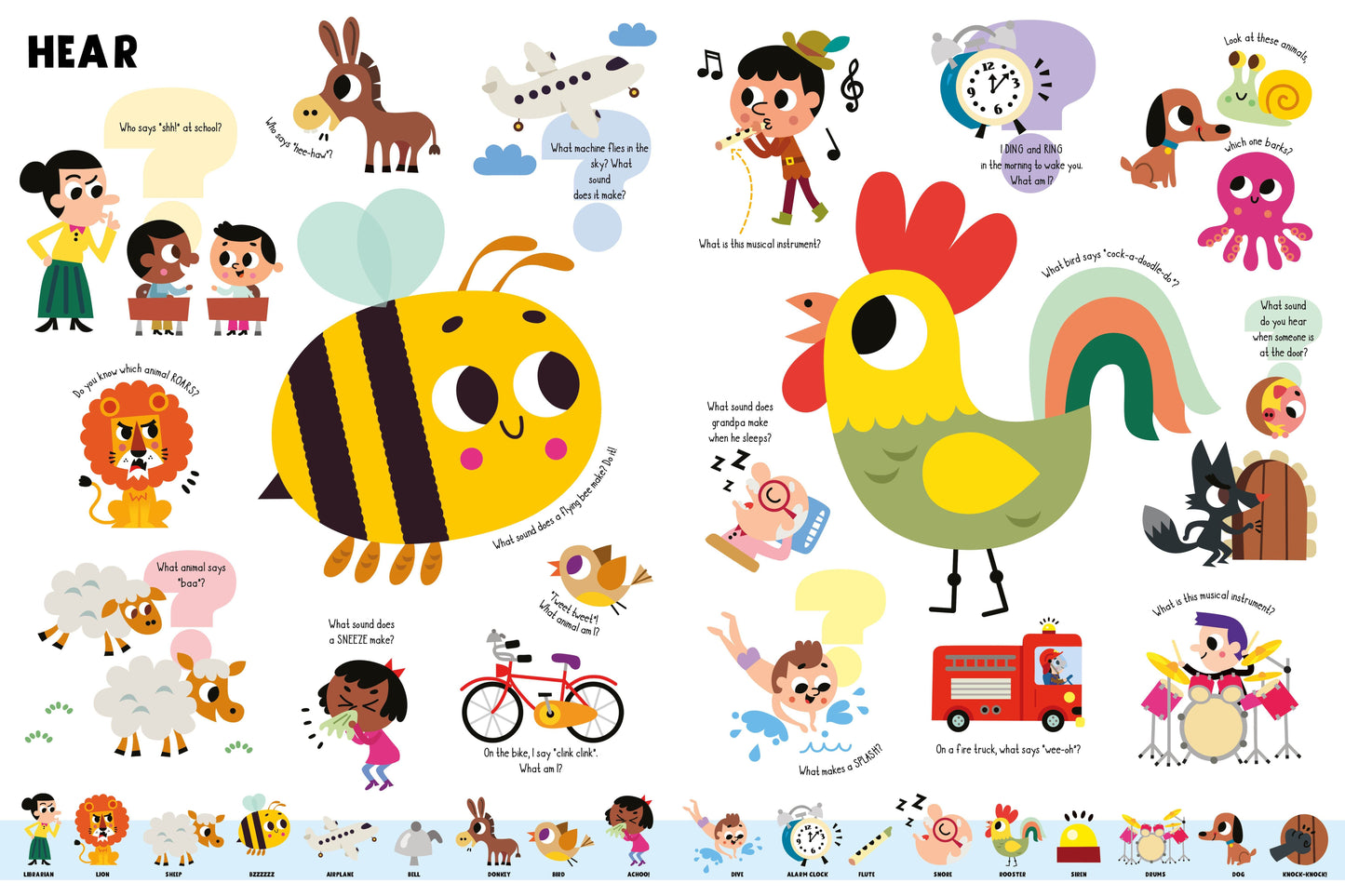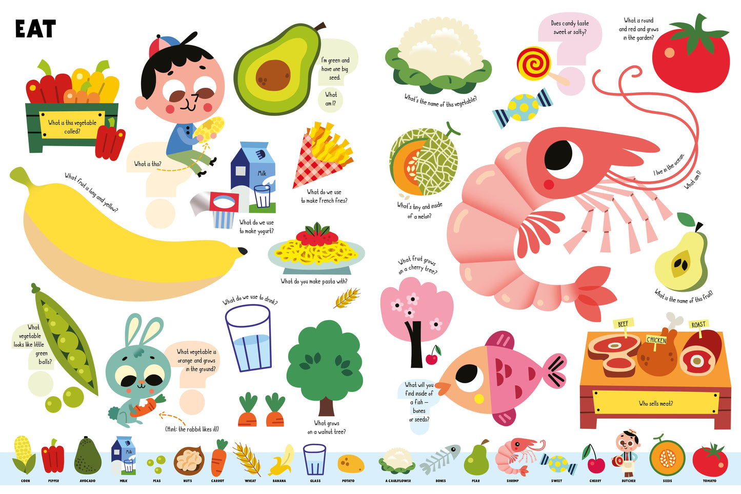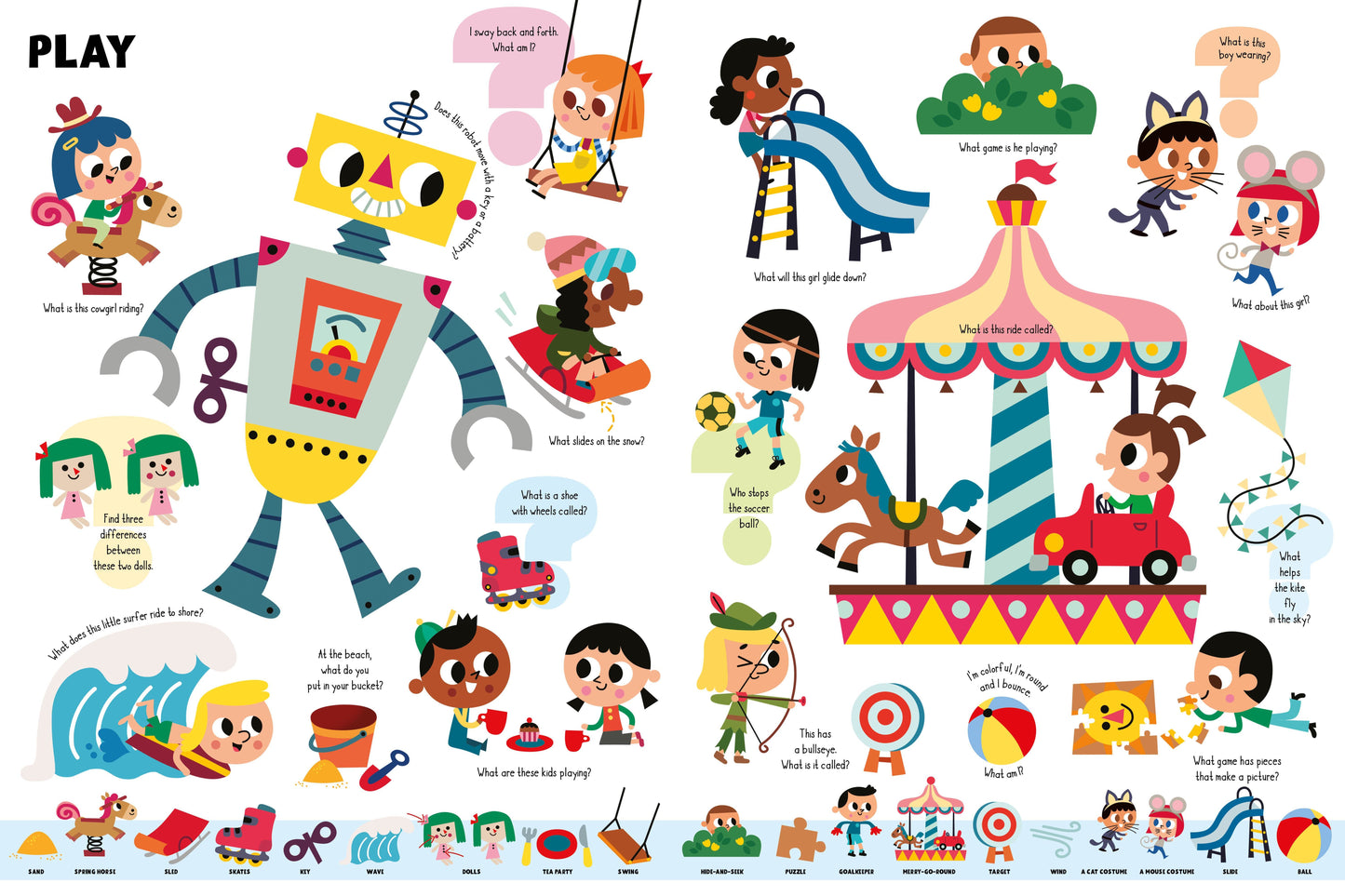 What do you find on a playground? What sound does a rooster make? Which foods are very sweet? Discover these questions and more on the pages of this bright and playful interactive book. The colorful pictures engage toddlers while prompting them to observe and answer corresponding questions. The large format feature loads of pictures on every spread, encouraging little learners to explore the pages to discover first words and vocabulary.