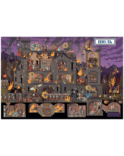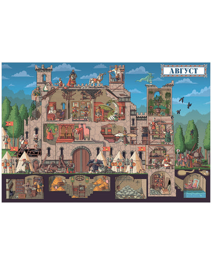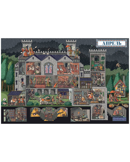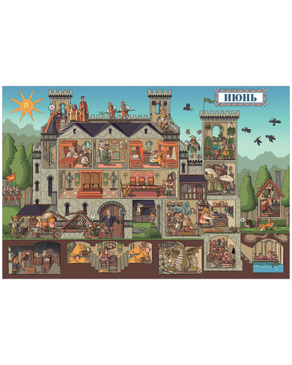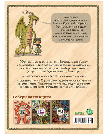 «Год в замке» — это книга-гляделка о временах года в одной волшебной стране. Каждый из 12 разворотов рассказывает, как живут и чем занимаются обитатели королевского замка в том или ином месяце. Внимательно рассматривайте картинки и шаг за шагом распутывайте цепочку таинственных событий, в которых не обошлось без героя другой книги автора — «Драконы. Факты, слухи и легенды».
