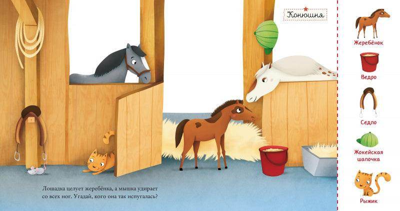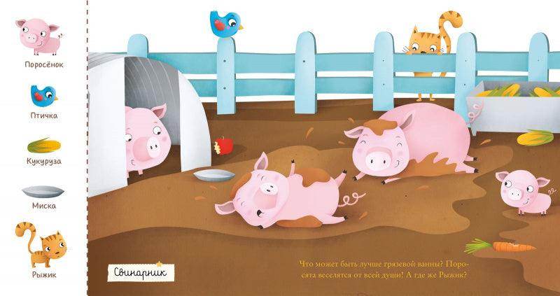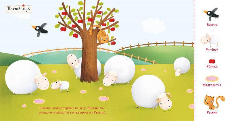 Здесь можно познакомиться с овечкой или лошадкой, посмотреть, как живут куры и кролики. И не забудьте, что один симпатичный герой проведет вас через всю книжку! Его нужно будет найти и показать на каждом развороте.