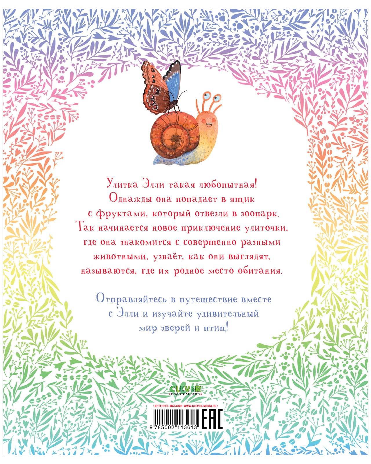 Улитка Элли такая любопытная! Однажды она попадает в ящик с фруктами, который отвезли в зоопарк. Так начинается новое приключение улиточки, где она знакомится с совершенно разными животными, узнаёт, как они выглядят, называются, где их родное место обитания. Отправляйтесь в путешествие вместе с Элли и изучайте удивительный мир зверей и птиц!