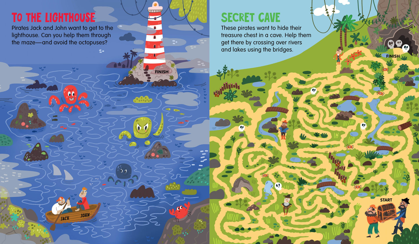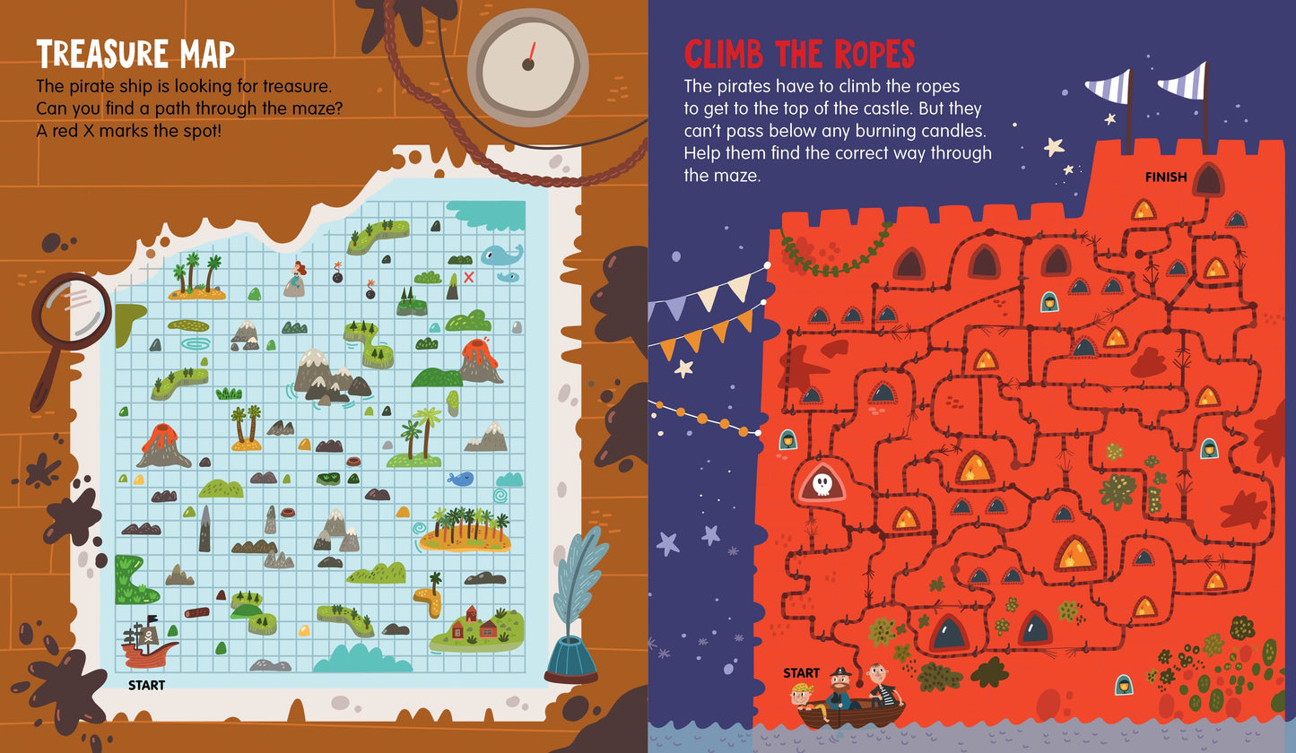 This fun, full-color book of mazes contains more than 25 challenging mazes for children to complete. Each activity features different pirate-themed scenes, such as searching for treasure and sailing past the sea monsters! The mazes are designed to promote logical thinking, and also enhance hand-eye coordination as children learn to manipulate a writing instrument to follow the mazes. The puzzles are straightforward enough for children to complete on their own, but also ambitious enough to provoke thought and reasoning. Young minds will be entertained for hours! This is the perfect gift for children who love mazes and anything to do with pirates. Illustrator Inna Anikeeva also illustrated Clever’s bestselling Mega Big Look and Find series, which has sold in 20 languages.