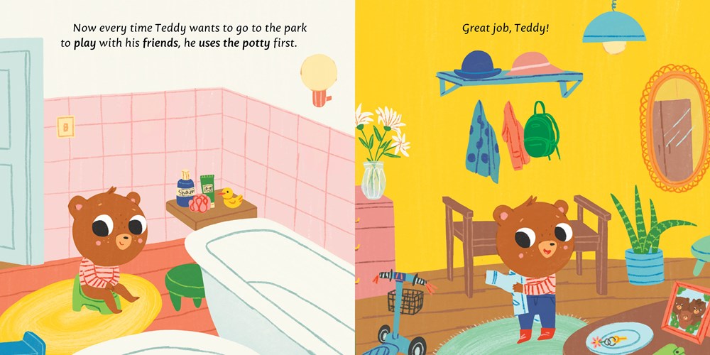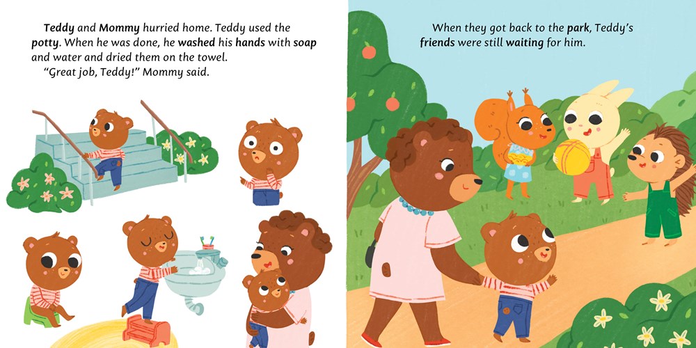 Teddy is going to the playground with Mommy, and he’s so excited! He’s sure he remembered everything—his trike, his ball, and his pail. But when they get to the park, Teddy realizes that he forgot something very important—he forgot to use the potty! So Mommy takes him back home so he can go potty and then rejoin his friends for a fun day at the playground. Children can follow along with Teddy as he learns to use the potty, and realizes the importance of always doing so before he leaves the house! Includes a step-by-step guide in the back.