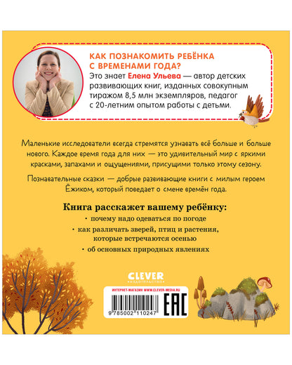 Книга "Приключения Ежика. Осень" в форме увлекательной сказки поделится с ребенком первыми научными знаниями: как определять время года по его приметам, почему надо одеваться по погоде, как различать зверей, птиц и растения, которые встречаются осенью, расскажет об основных природных явлениях и смене сезонов.