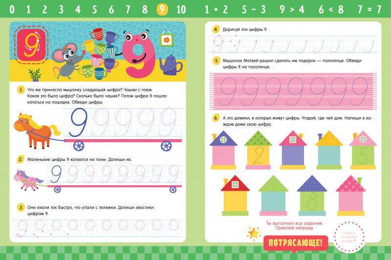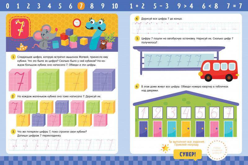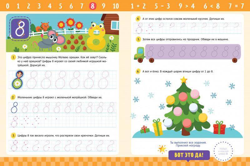 Задания в тетради заложат прочную основу для уверенного и красивого написания цифр. В конце тетради ребенок найдет веселый лабиринт, который разовьет мелкую моторику и подготовит руку к письму.