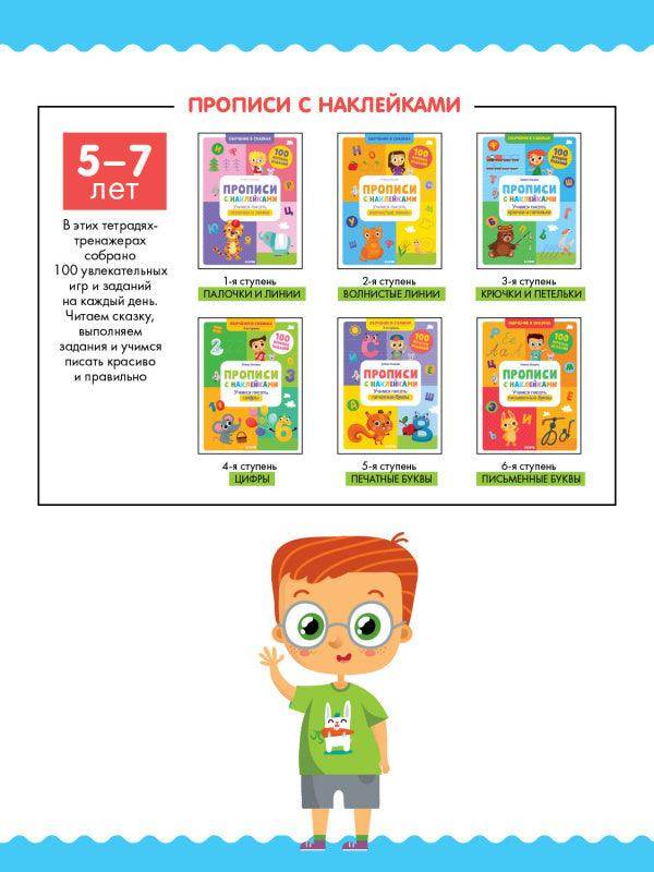 Серия «Обучение в сказках» — с помощью прописей с наклейками ваш ребенок подготовится к чтению и письму в процессе веселой игры! В этих тетрадях-тренажерах собрано 100 увлекательных игр и заданий на каждый день.