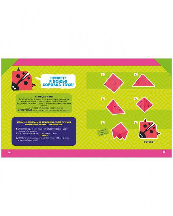 Эта тетрадка - отличный способ развить творческое мышление у вашего маленького гения. Здесь живут главные герои - поросёнок, божья коровка, мышка и житель сказочной страны. Ваш малыш сложит их мордочки в технике оригами из готовых шаблонов, и они станут ему верными помощниками в игре с тетрадью. Ребёнок будет рисовать и дорисовывать, складывать оригами и делать аппликации, сочинять истории, придумывать названия, искать аналогии, а также попробует себя в роли дизайнера одежды и многое другое. Именно благодаря разным техникам и приёмам будет происходить разностороннее творческое развитие малыша.