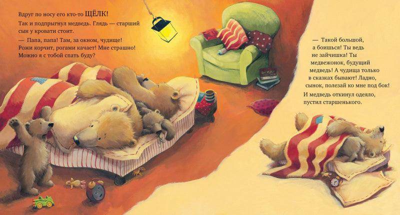 Вот только и папе теперь не спится! Шумит лес, ветви деревьев стучат в окно, гремит гром. И что это за жуткая тень на стене? Быть может медвежата правы, и за дверью кто-то есть?