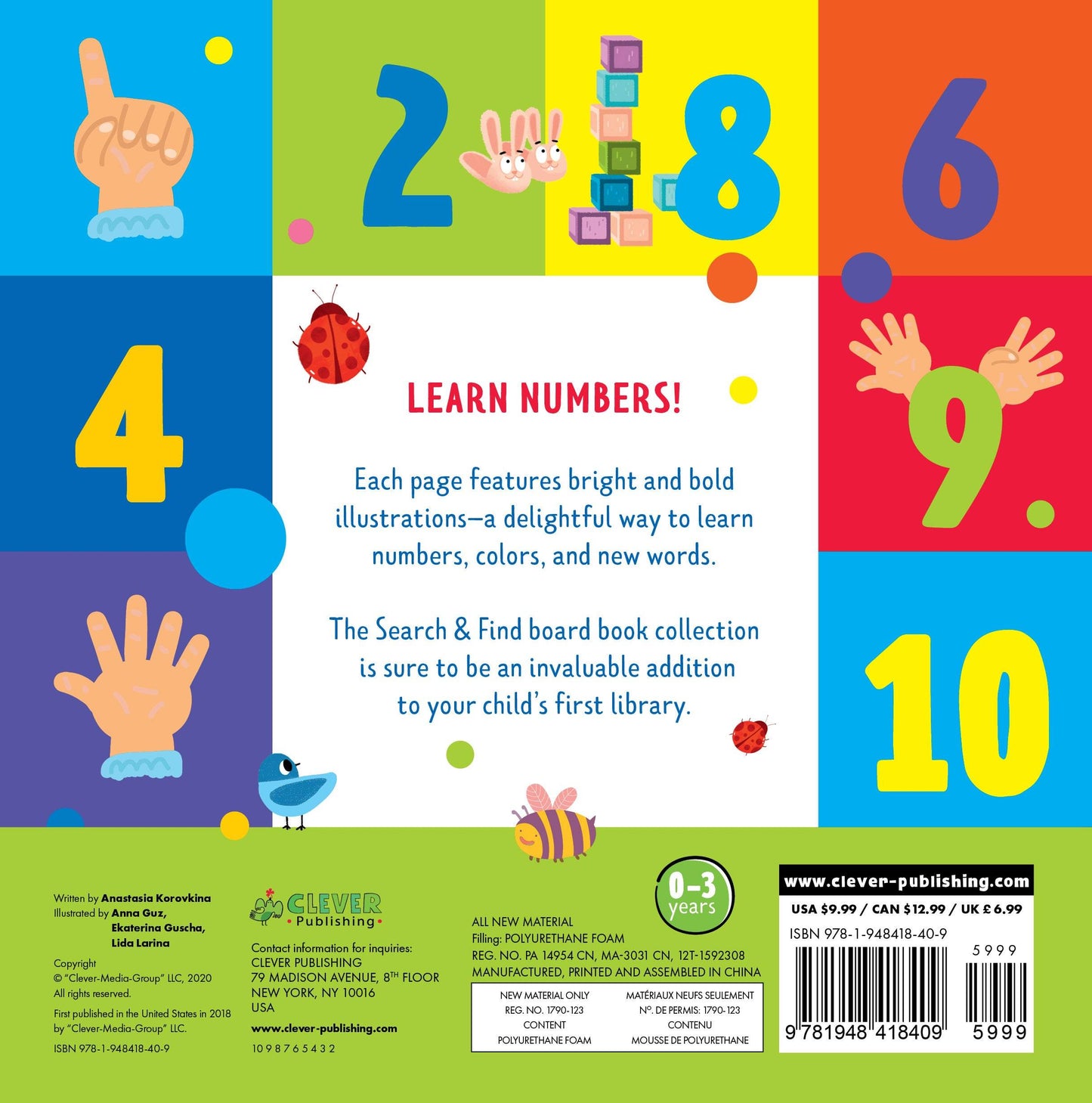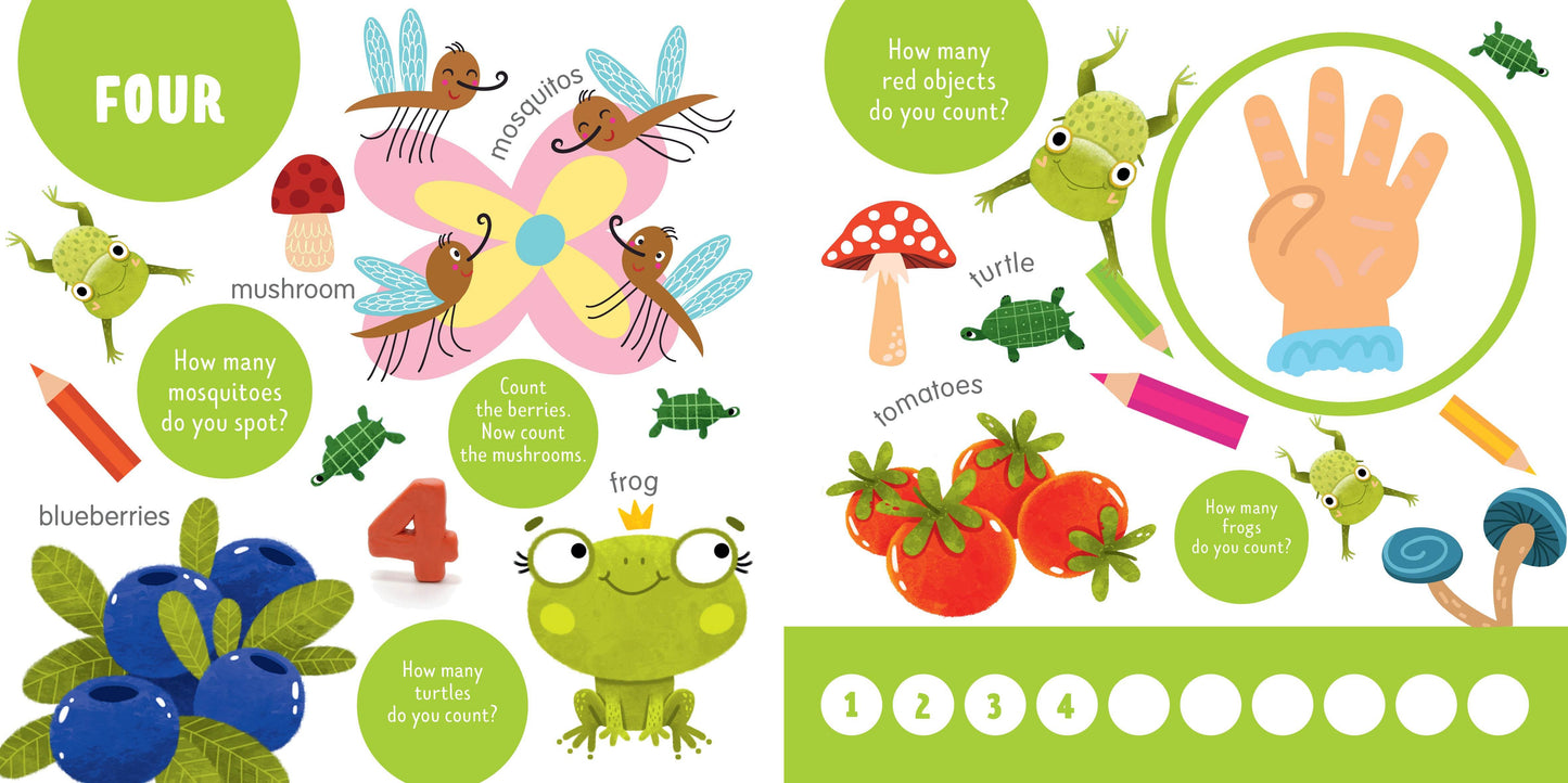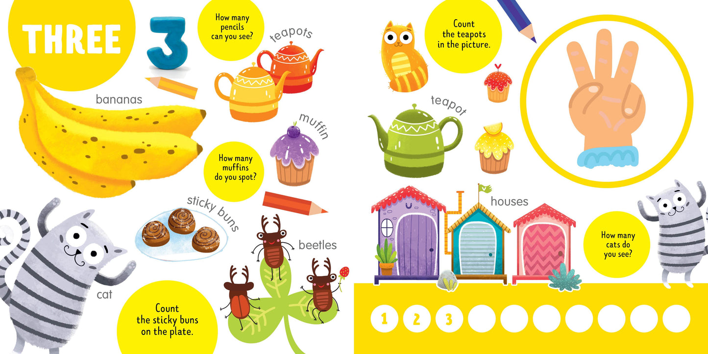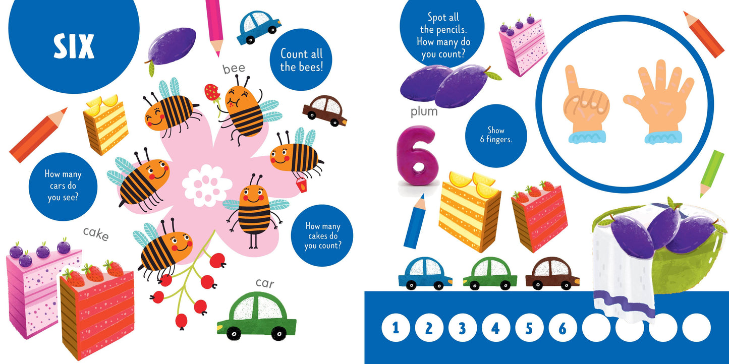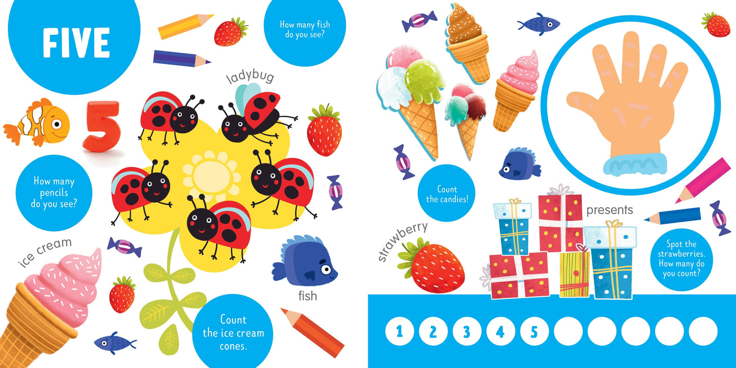This colorful multipurpose padded board book contains Search & Find activities, exercises to learn number and colors, and an encyclopedia all under one cover!Each spread features unique content that teaches children numbers through activities such as objects to find and questions to answer all designed to stimulate logical and creative thinking. Children will easily grasp the concepts of numbers and colors, and learn new words as well.The toddlerfriendly format with a padded cover, rounded corners, and thick cardboard pages is prefect for early readers.