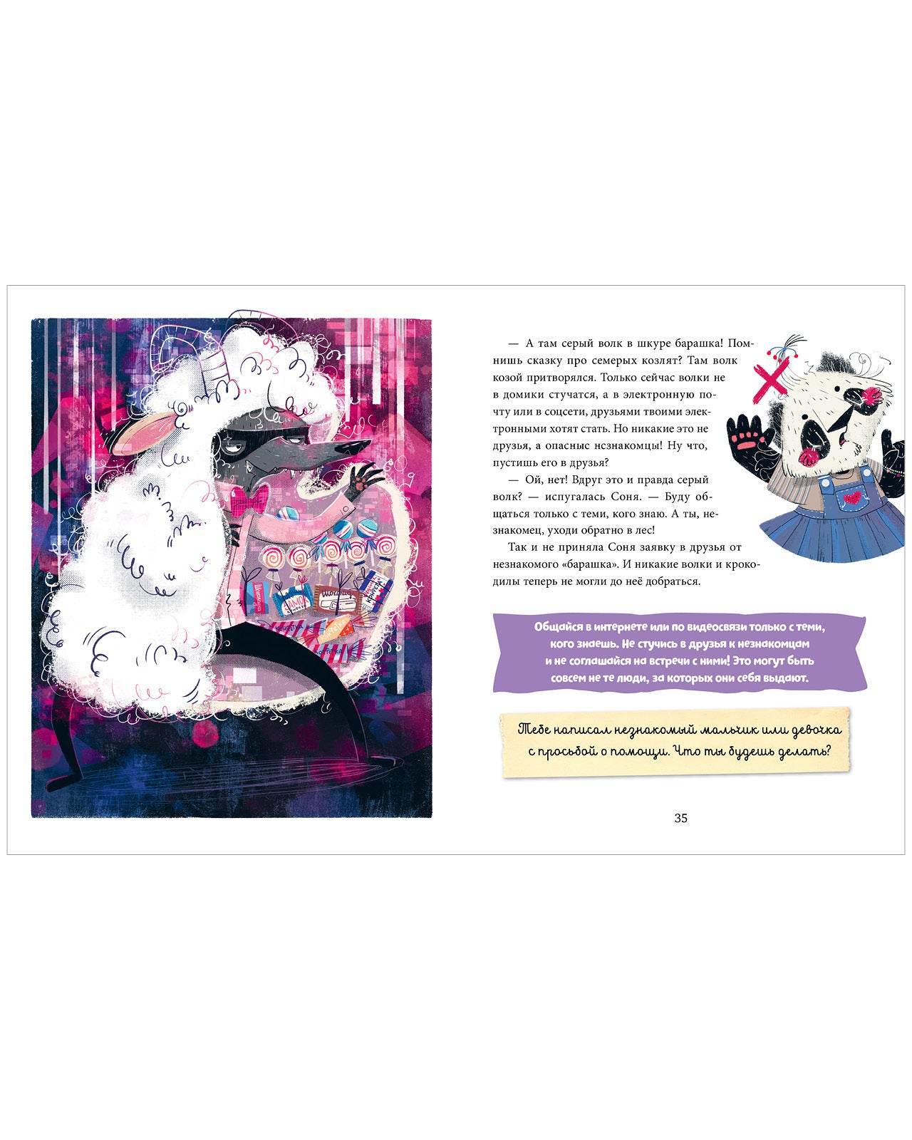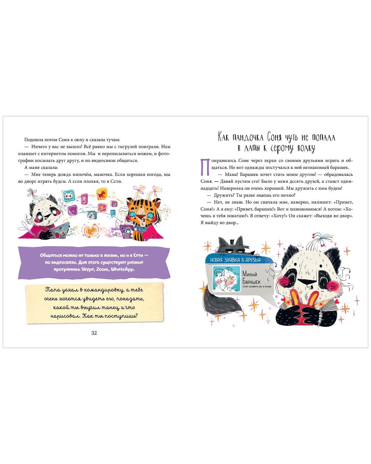 Героиня книги, доверчивая пандочка Соня, еще только учится пользоваться гаджетами и интернетом, поэтому часто попадает впросак: по неосторожности ломает смартфон, мешает окружающим громкими разговорами, переходит по всем ссылкам из писем. Истории о ней помогут ребенку взглянуть на ситуацию со стороны и самостоятельно сделать выводы о том, как лучше поступать. В конце каждой сказки ждет правило-помощник и предметно-ролевая игра, чтобы закрепить правильную модель поведения.