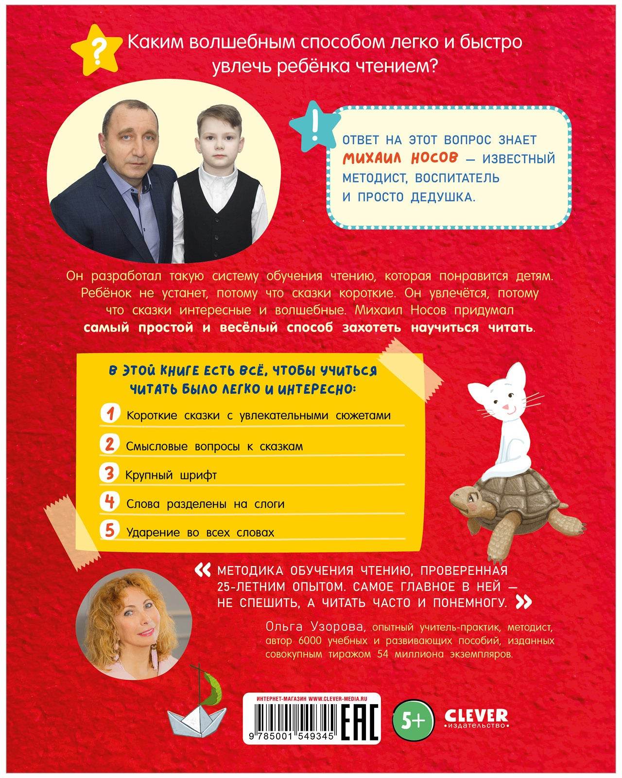 «Большая книга сказок. Читаем по слогам» — это незаменимый помощник для начинающего читателя. Один короткий текст за другим, и постепенно ребенок научится плавно соединять буквы в слоги, слоги в слова, а слова в связные предложения. В первых из пятидесяти двух сказок — от 40 до 80 слов, и любую из них малыш сможет прочитать за 3 минуты. К каждому тексту есть готовый список вопросов, чтобы ребенок обязательно осмыслял то, что он прочитал. Далее количество слов плавно увеличивается до 152. С книгой «Большая книга сказок. Читаем по слогам» процесс обучения будет максимально комфортным и легким. Ребенок не устанет, потому что сказки короткие. Он увлечется, потому что они интересные и волшебные. Будет делать меньше ошибок и быстро почувствует свой прогресс, потому что есть подсказки. Читайте вместе, понемногу, но регулярно, и к концу книги малыш полностью освоит слоговое чтение. Несмотря на то что книга рассчитана на младших школьников, по ней можно заниматься с 5 лет и ранее — все зависит от знания букв и желания самого малыша. Учитесь читать легко и весело! Михаил Носов — известный методист, воспитатель и просто дедушка. Он разработал такую систему обучения чтению, которая понравится детям.