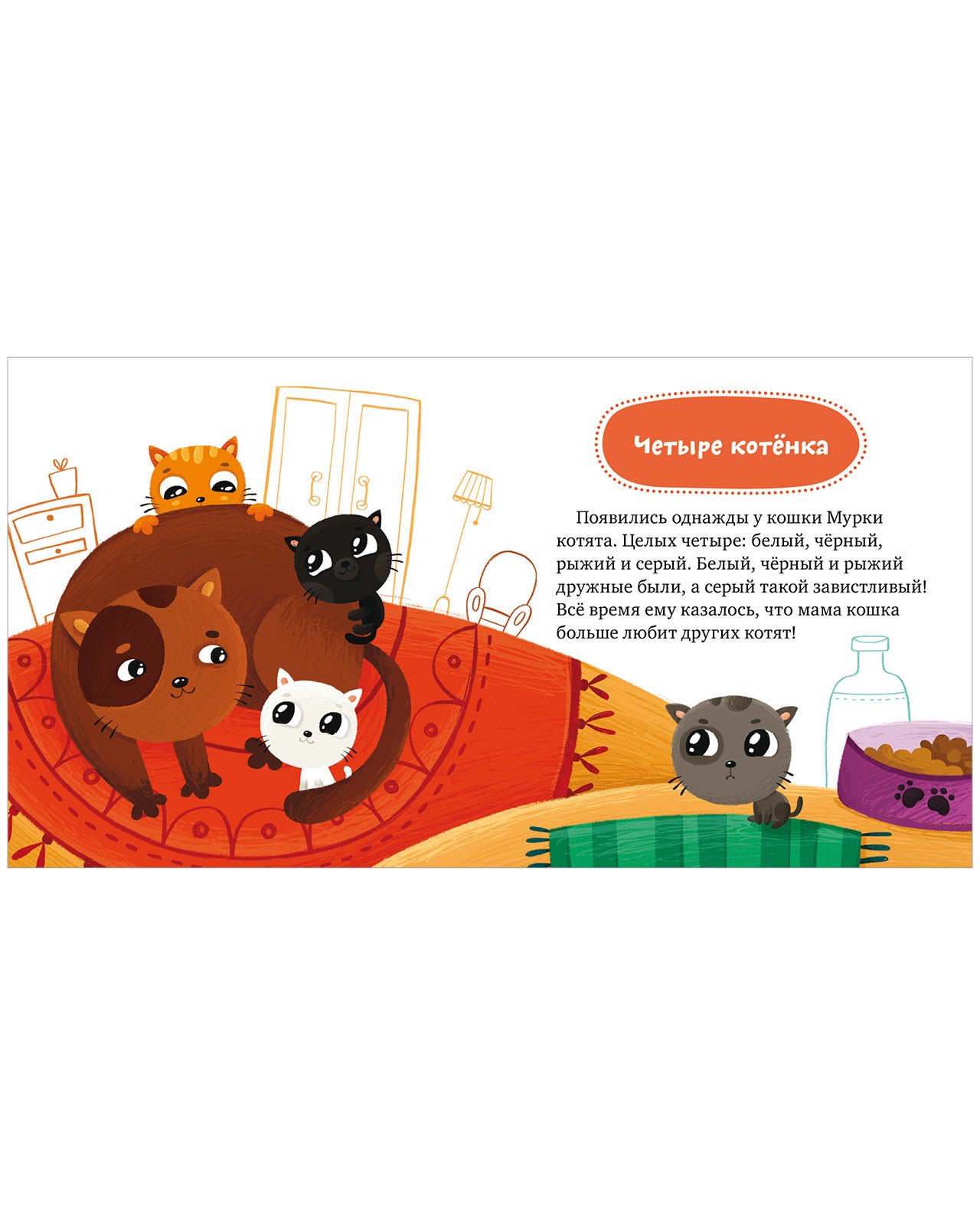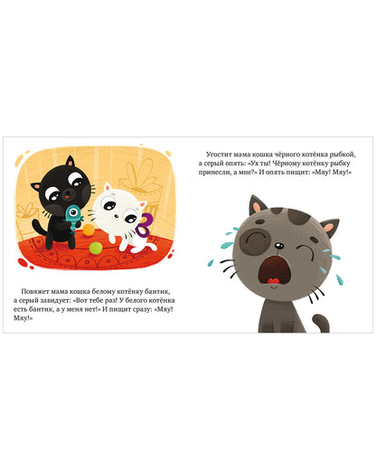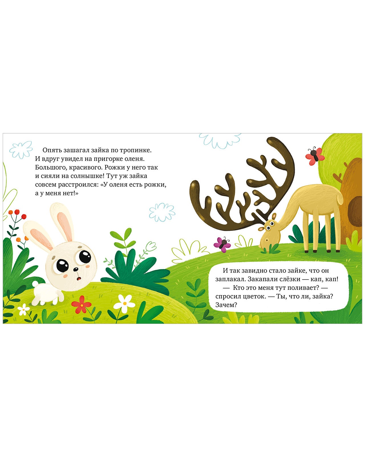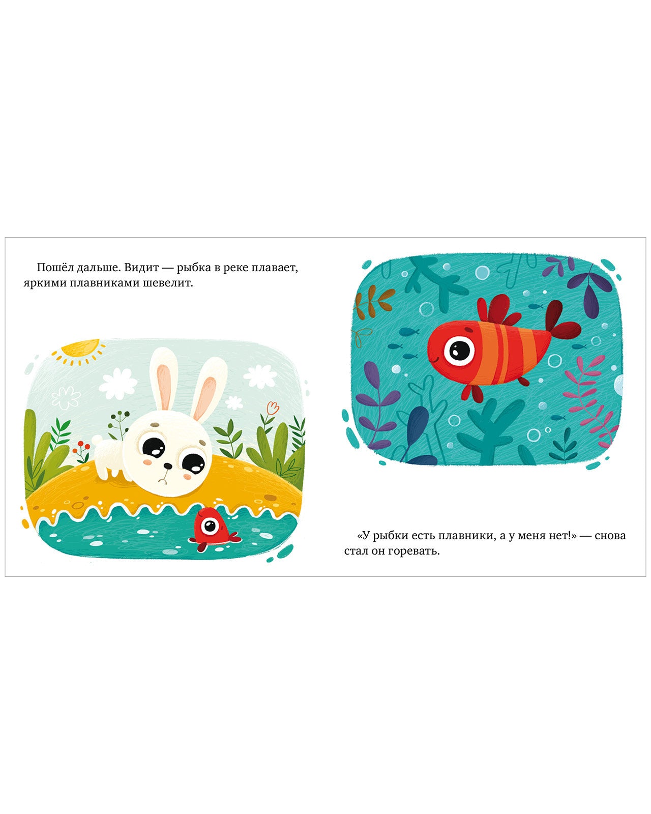 Маленький зайчик переживает: у птицы есть крылышки, у рыбки — плавники, а у оленя — рожки. Но, постойте, зайчику тоже кое-что досталось! Как только он это понимает, зависть исчезает бесследно. Вторая сказка — про братьев и сестричек. У кошки Мурки четыре котенка — белый, черный, серый и рыжий. Все живут дружно, и только серому котенку все время кажется, что его любят меньше всех. Но так ли это? Конечно же, мама кошка любит всех котят одинаково!