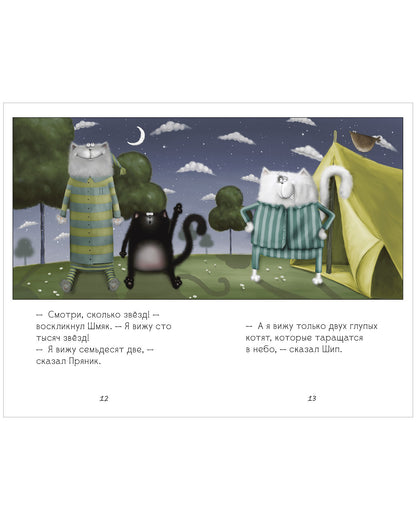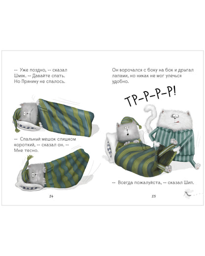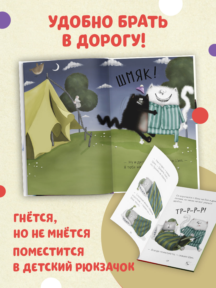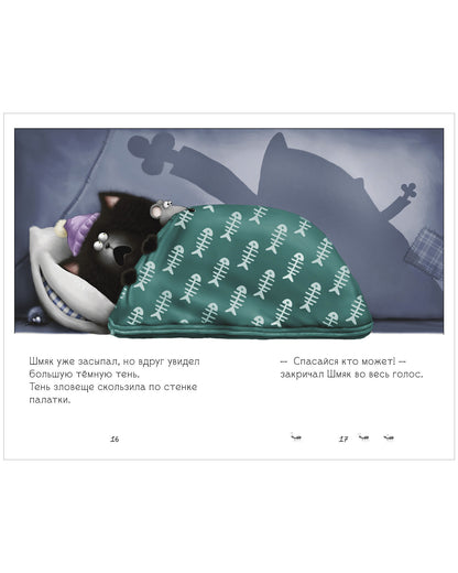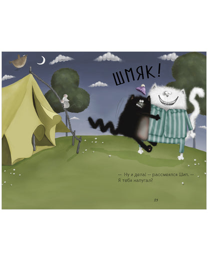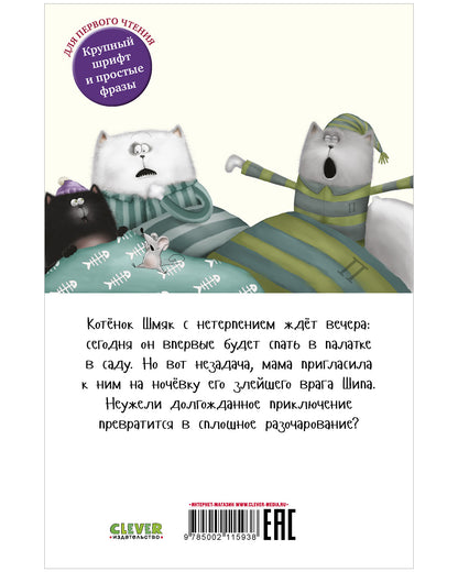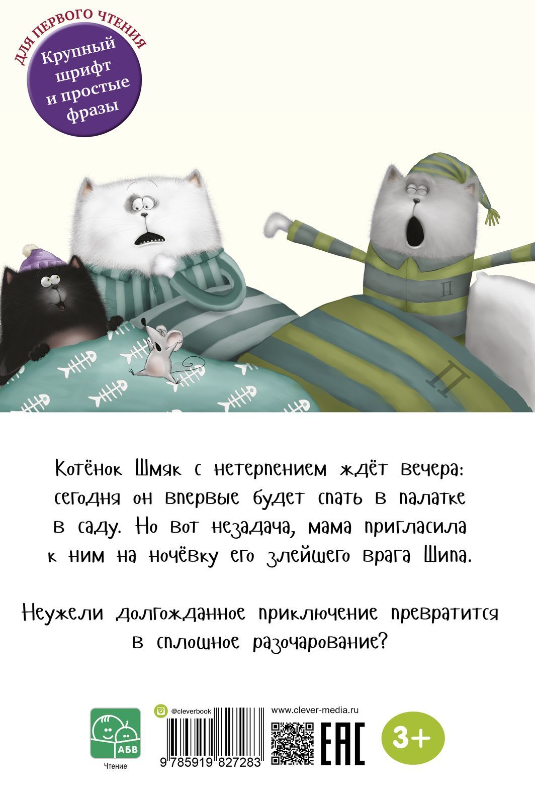 Для первого чтения. Крупный шрифт и простые фразы! Котёнок Шмяк с нетерпением ждёт вечера: сегодня он впервые будет спать в палатке в саду. Но вот незадача, мама пригласила к ним на ночёвку его злейшего врага Шипа. Неужели долгожданное приключение превратится в сплошное разочарование?