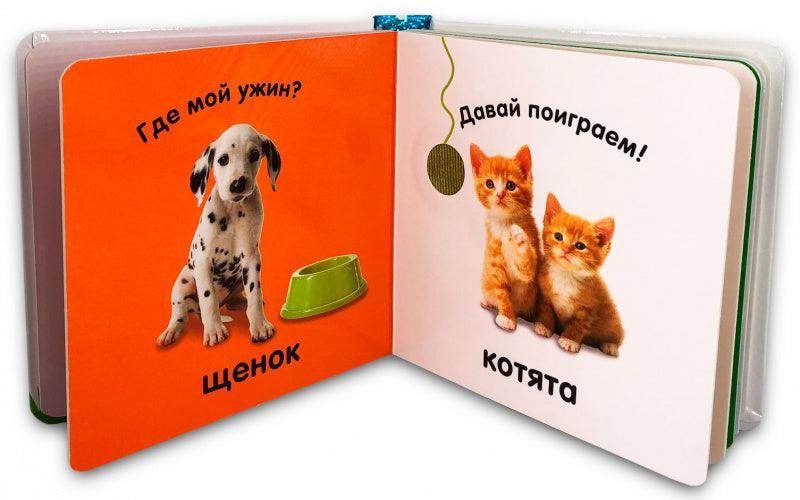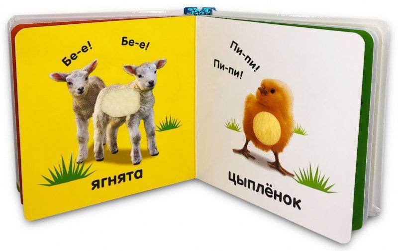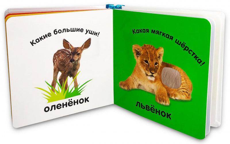 На каждой странице — яркие фотографии с приятными на ощупь вставками из пушистого и гладкого меха, ткани и блестящей фольги. Малыш сможет познакомиться и пригладить шерстку олененку, ягненку, котенку и другим пушистым детенышам животных.