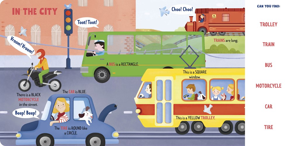 Children can learn the words for 75 things that go, including construction machines, rescue vehicles, and things that move on the water. From car, train, and motorcycle to boat, tractor, and bicycle, young readers will love to search the bright, colorful pages to identify the things that go. With interactive prompts and a search and find activity on every spread, this is the perfect introduction to vehicles of all kinds!