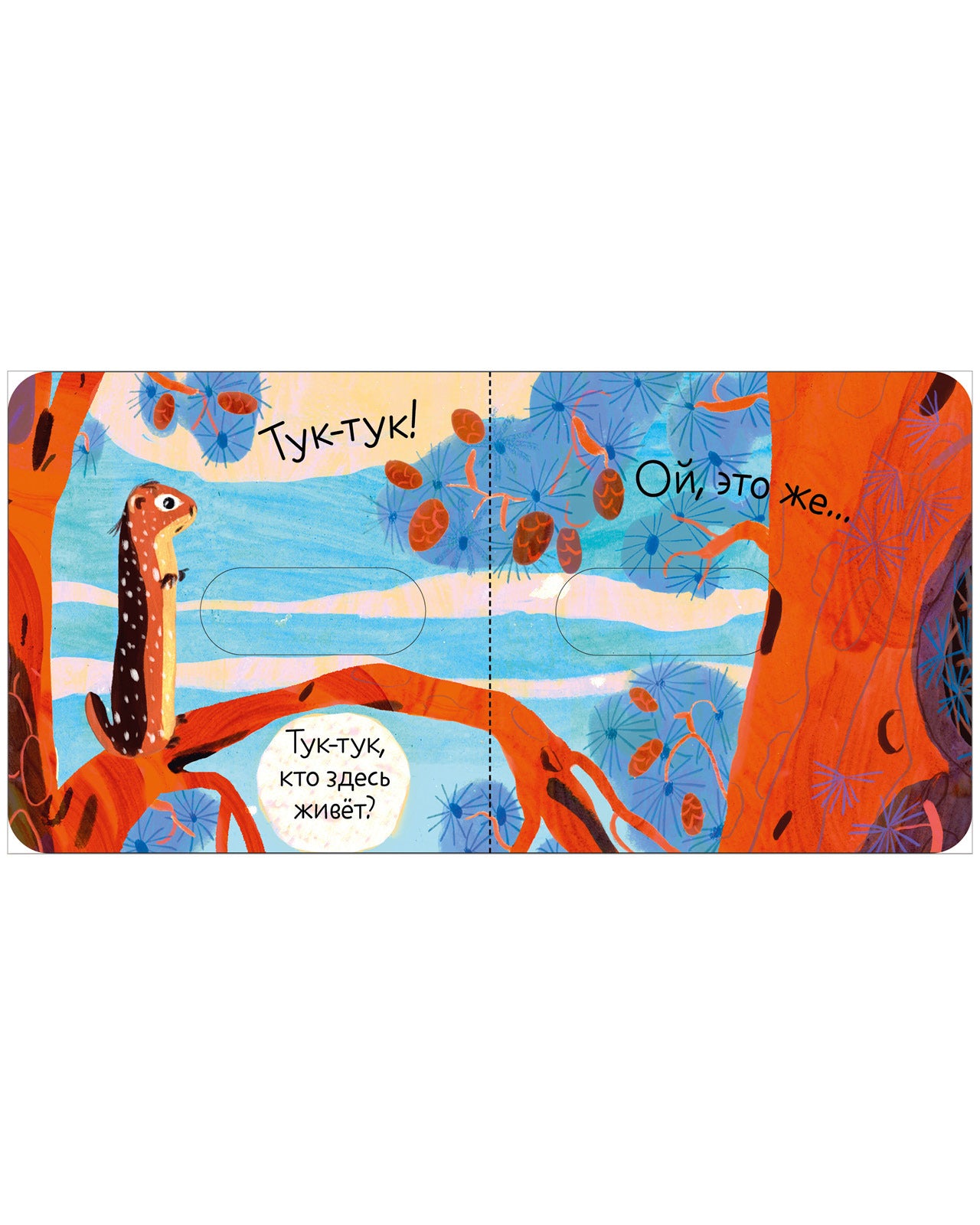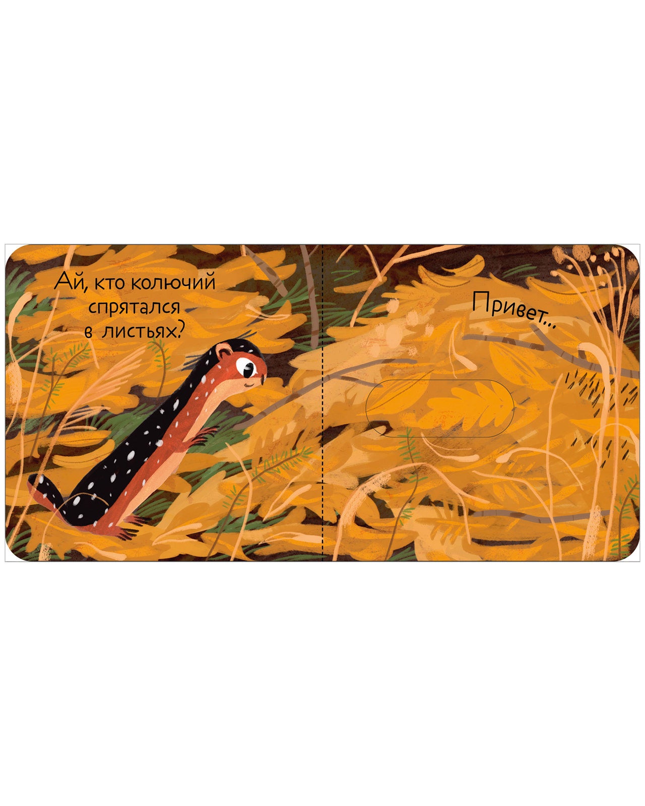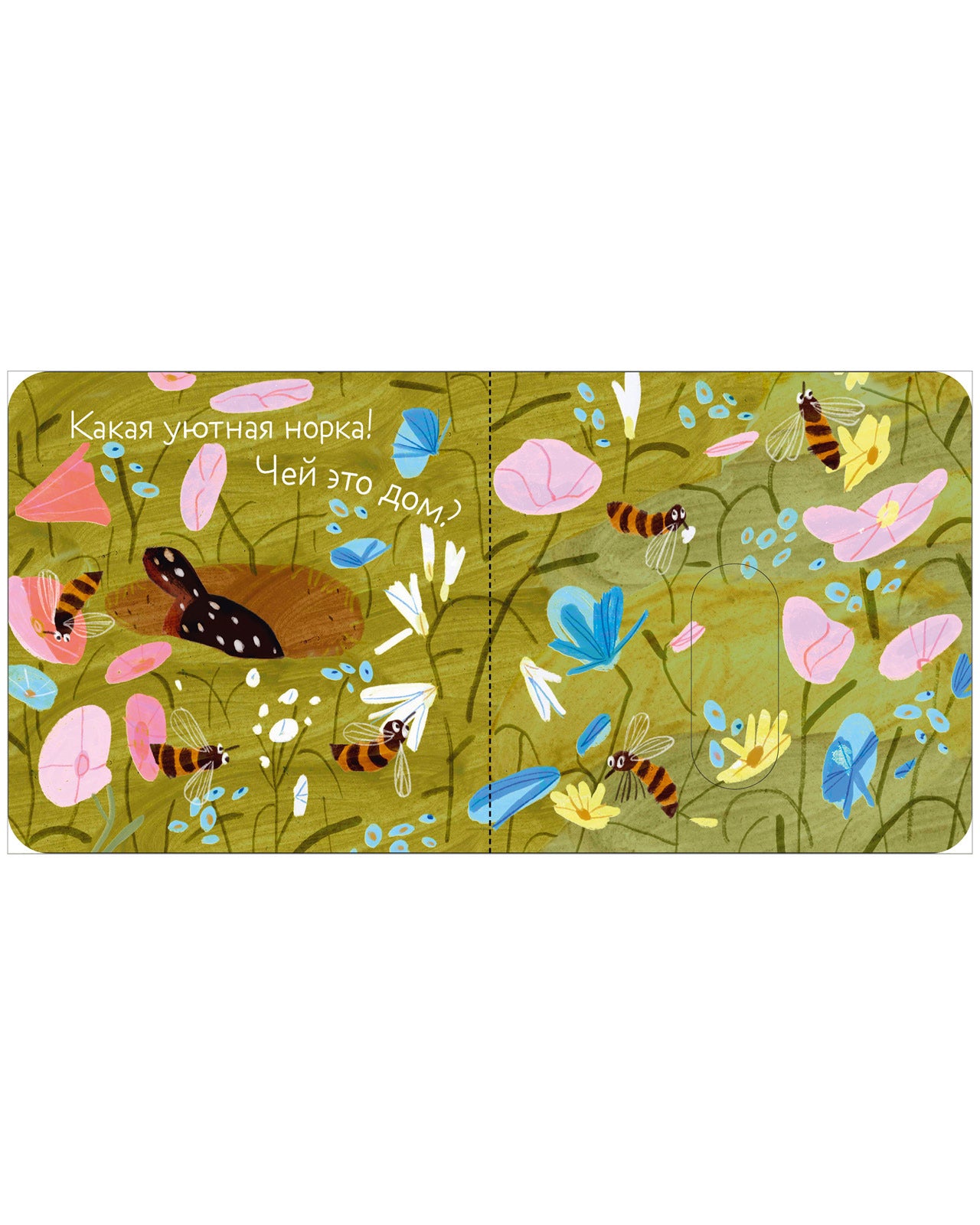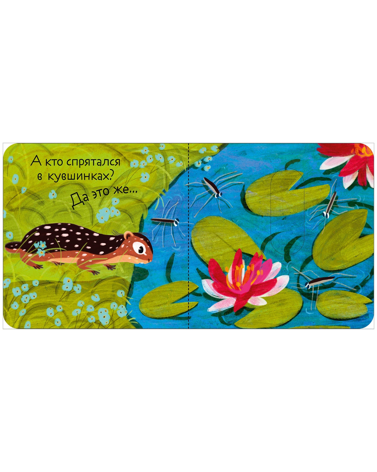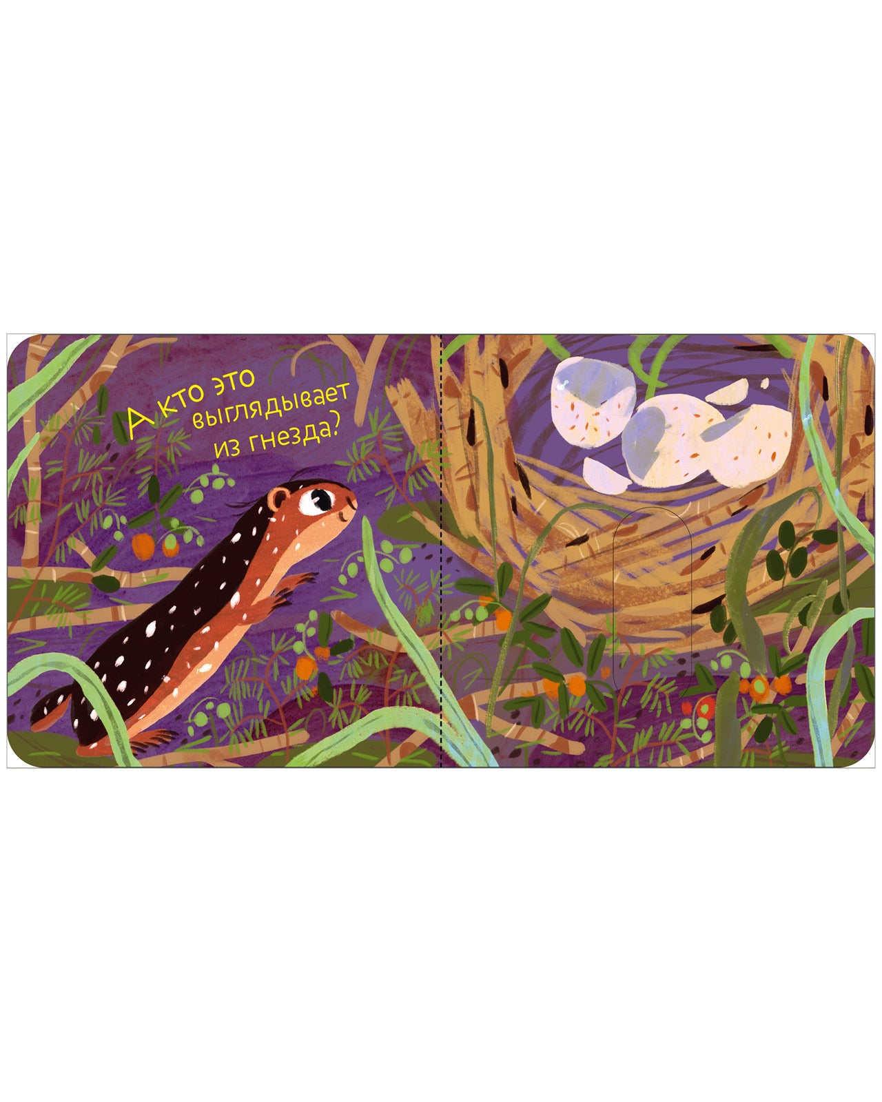 Маленький суслик очень любопытный, ему интересно: кто живет в зарослях деревьев, в норке, на ветках и в пруду? Следуя за милым персонажем и открывая створки, малыш побывает в гостях у самых разных зверей.