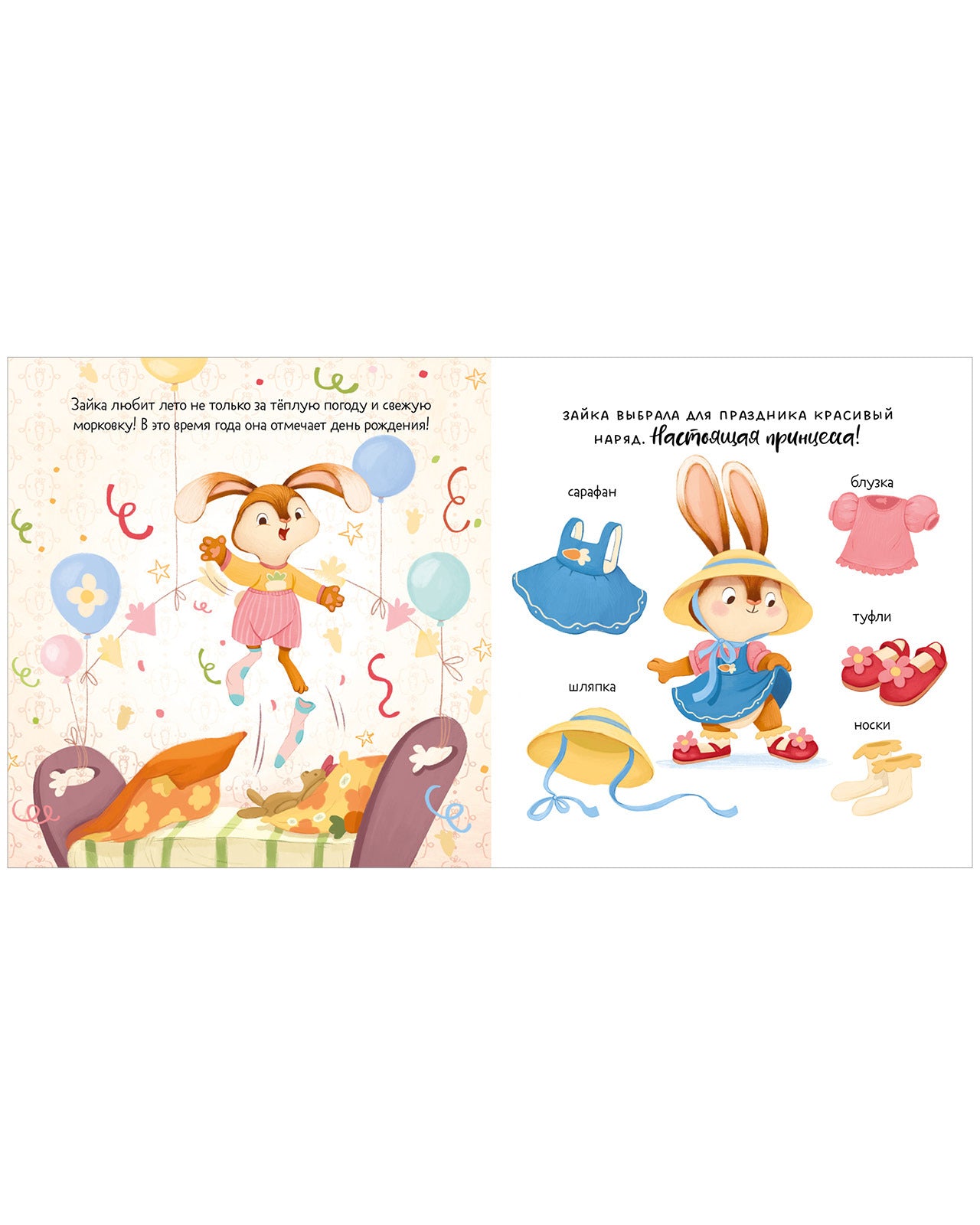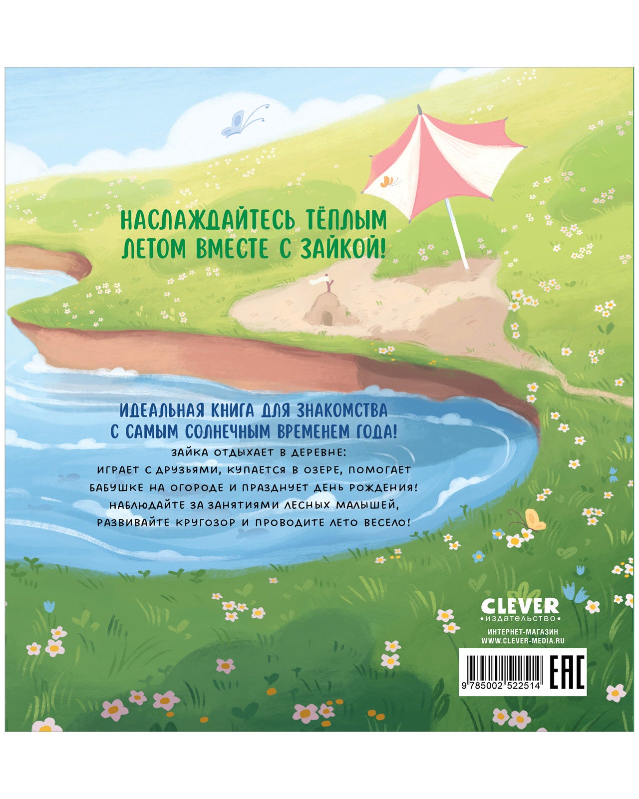 Наслаждайтесь теплом вместе с зайкой! Это самая солнечная и летняя книжка-картинка для первого чтения, для малышей от 2 лет. Здесь есть и приключения животных, и развивающие задания.